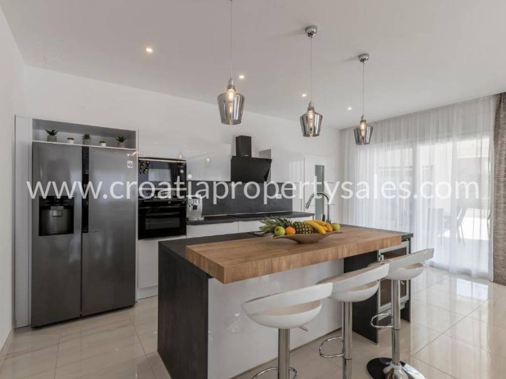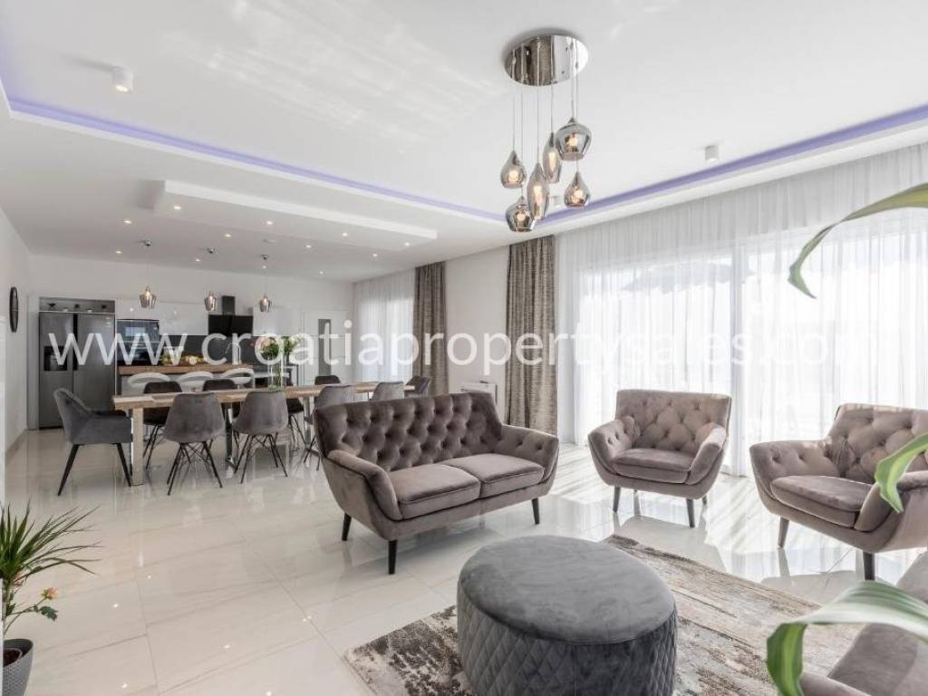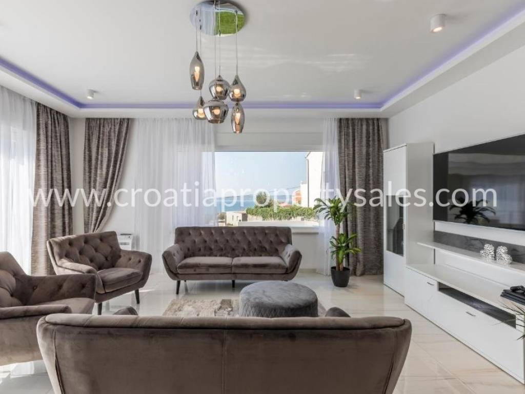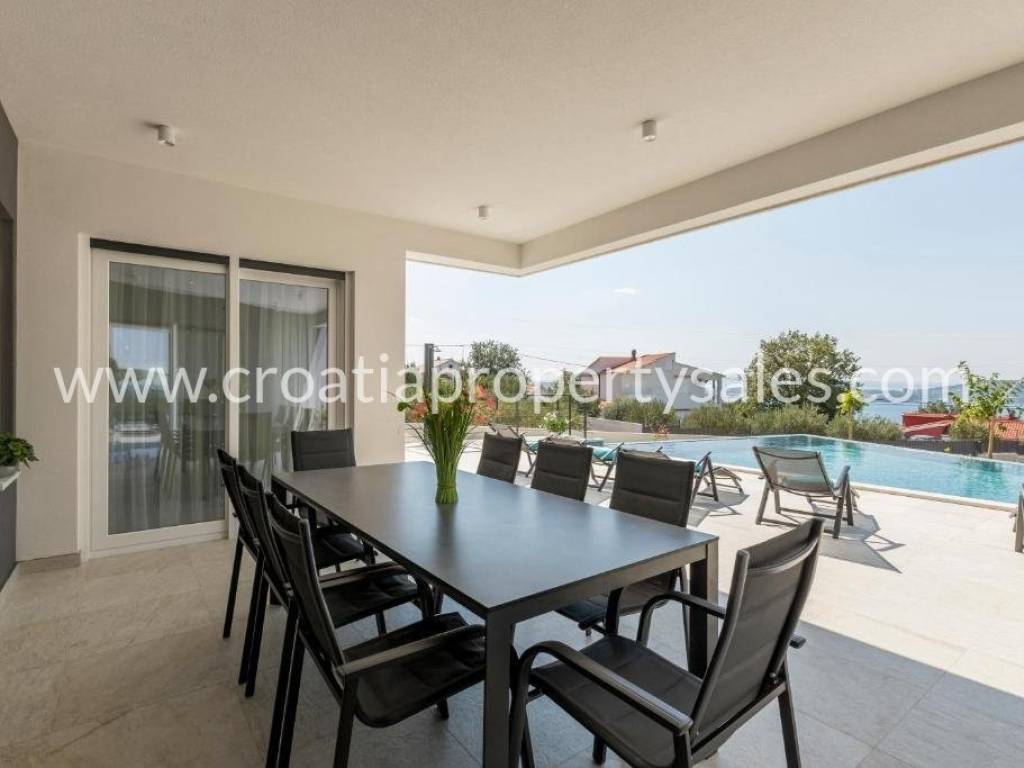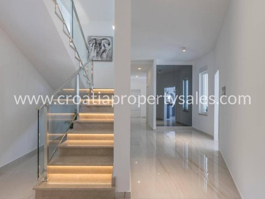 Luxury villa with pool and sea view in a beautiful location near Split. The villa has a total of 350 m2 and has 4 floors.It is located on a plot of 1700 m2. There is a storage room in the basement. On the ground floor there is a spacious living room, kitchen with dining room which has access to a spacious courtyard with pool, sundeck, barbecue and dining area and a garden with Mediterranean plants. On the first floor there are 4 luxurious bedrooms each with its own bathroom and balcony. On the first floor there is also a terrace with jacuzzi and beautiful sea view, gaming room, gym and sauna. On the second floor there is a bedroom with bathroom and large terrace (120 m) with beautiful sea view and all four sides of the world. The villa is south-oriented, bright and sunny. It is possible to park four cars. All essential facilities are nearby, yet it has a quiet environment and privacy.