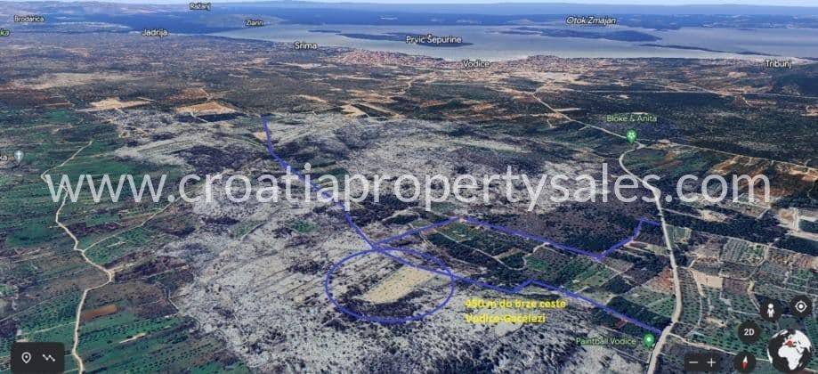 Vodice, agricultural land 15988m2, ownership 1/1, consists of 2 plots of approximately 8000m2, the possibility of building at least 2 houses of 30m2 with irrigation pools, etc. as part of the family farm in a certain percentage and the rest for tourism or processing, and according to spatial plan of the city of Vodice and ŠK County.
