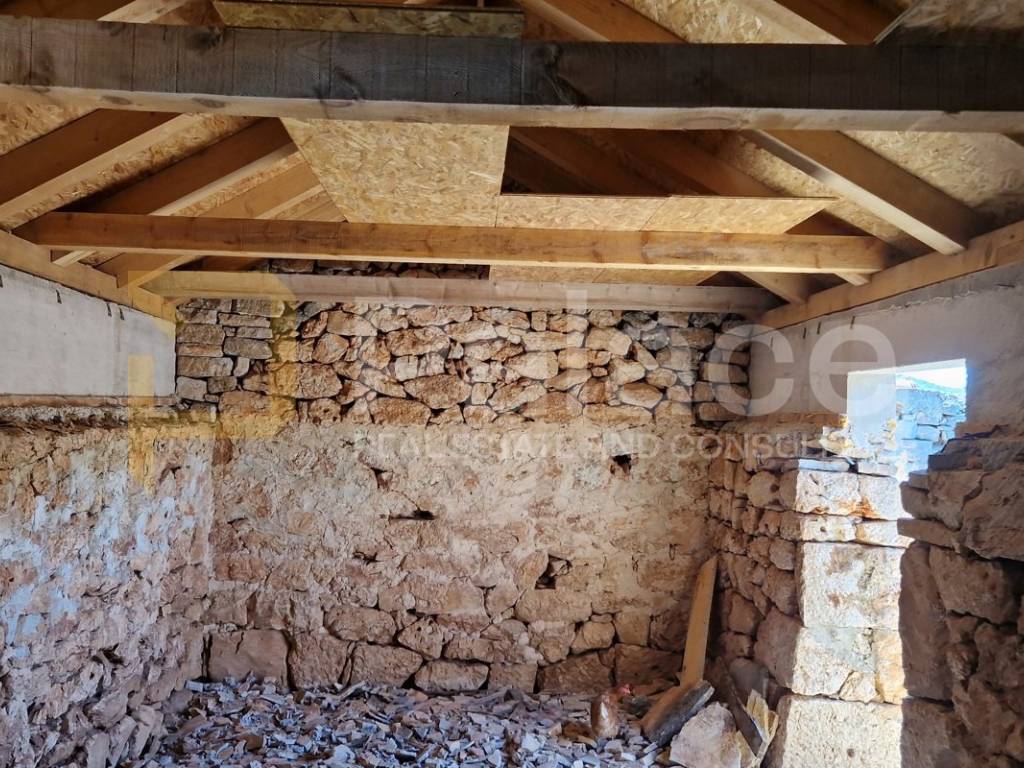 The house is original stone, with a planned large terrace in front, and a construction space of approximately 600 m2 behind. The gross area is around 50 m2, with thick original stone walls and a new roof structure. The interior space has not been partitioned, allowing the new owner to create their own layout according to their own taste and preferences.