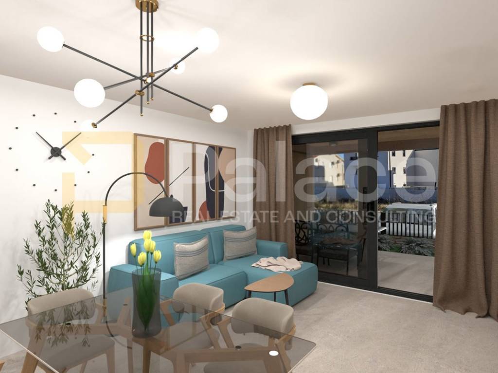 An attractive two-bedroom apartment on the first floor of a modern residential building with a total of six apartments is for sale, located in a peaceful new settlement just 350 meters from the sea and the nearest beach.