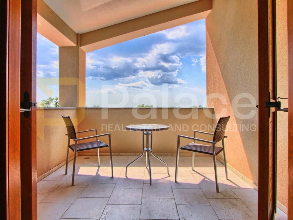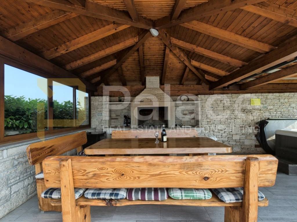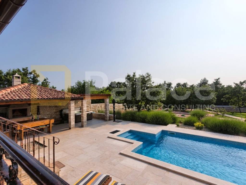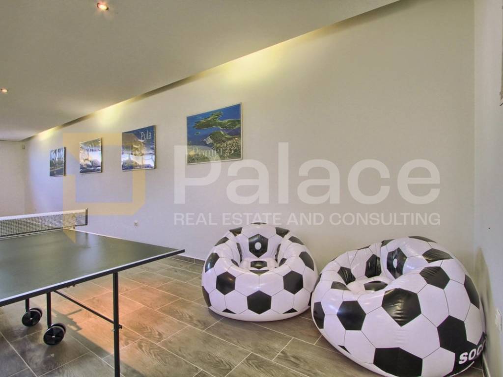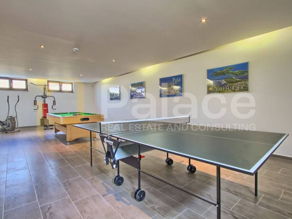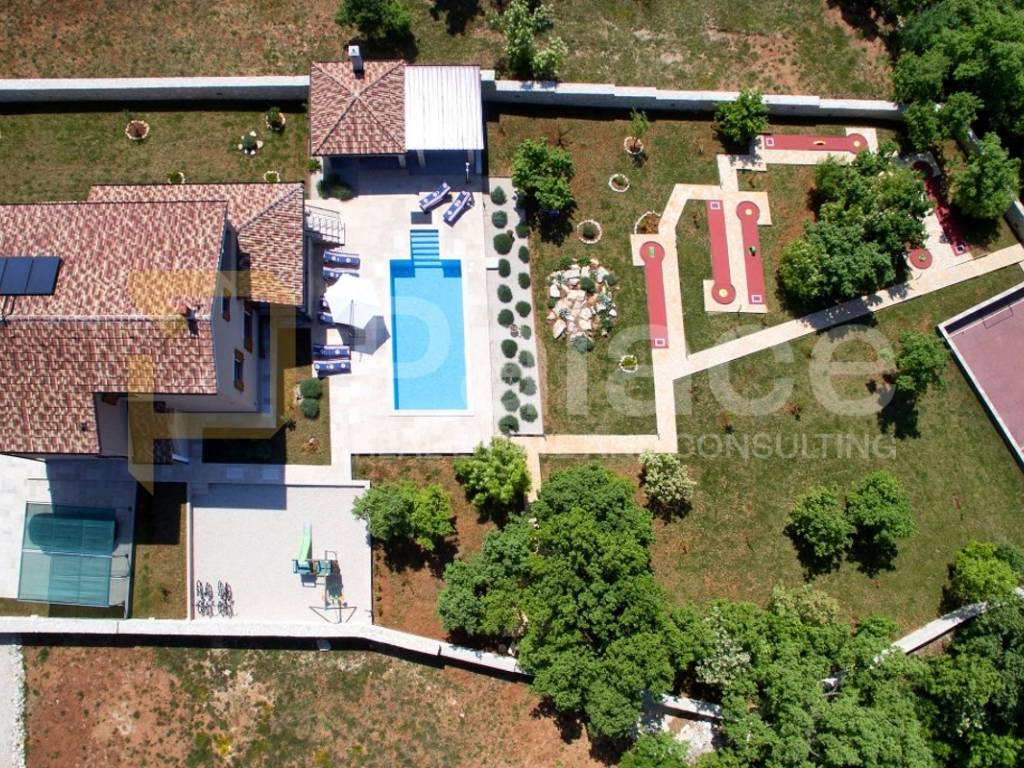 The exterior of the villa includes a heated pool of 36 m, a spacious terrace of 100 m, a covered barbecue fireplace with seating area, parking for four vehicles, a children's playground, and mini golf. For sports enthusiasts, there is also a multifunctional court (16x8m) for small football, basketball, and volleyball, and an additional feature includes a jacuzzi for 6 people.