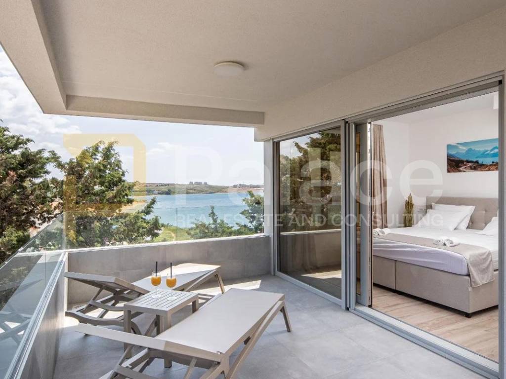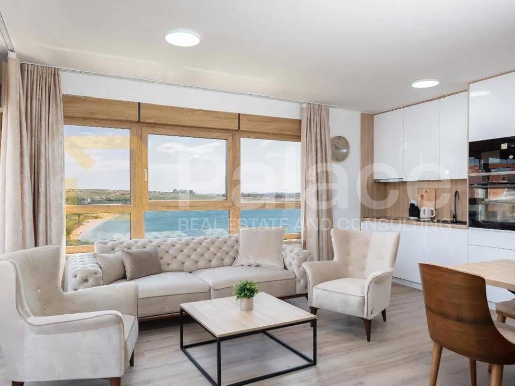 The apartment consists of a hallway, an open concept living room with a kitchen and dining area, and access to a balcony with an unobstructed view of the sea, two bedrooms, a bathroom, and a toilet.
