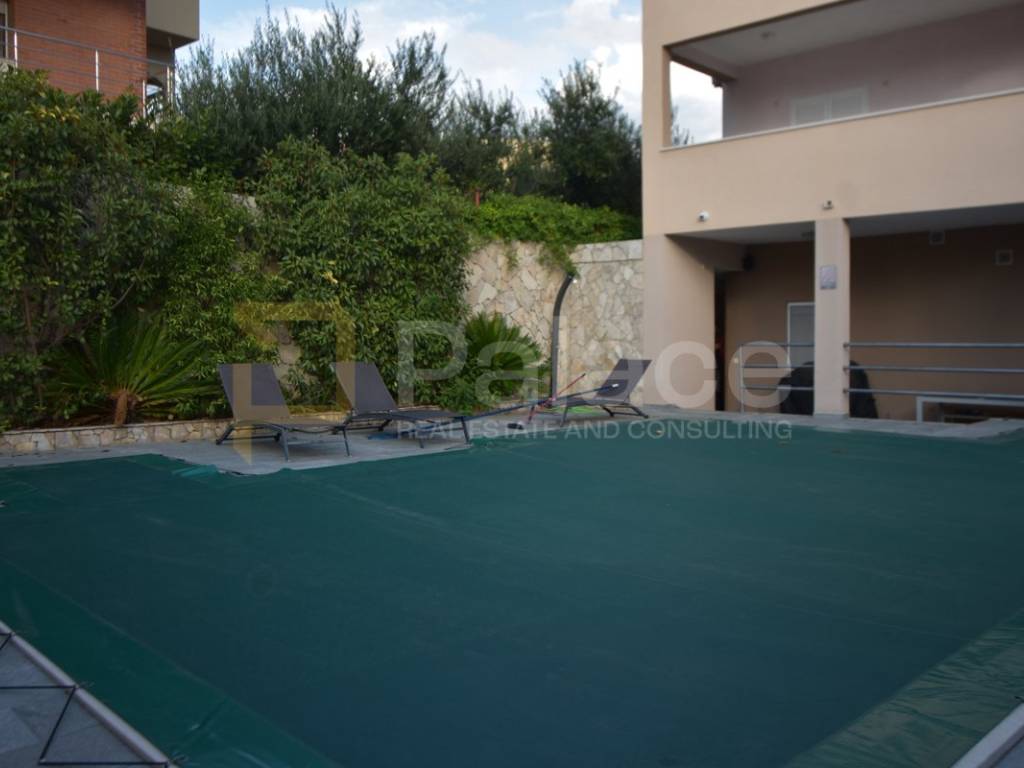 The apartment includes a terrace with an outdoor kitchen and a spacious yard with a pool and a cellar.