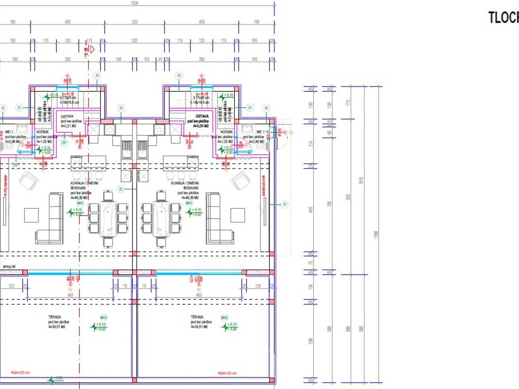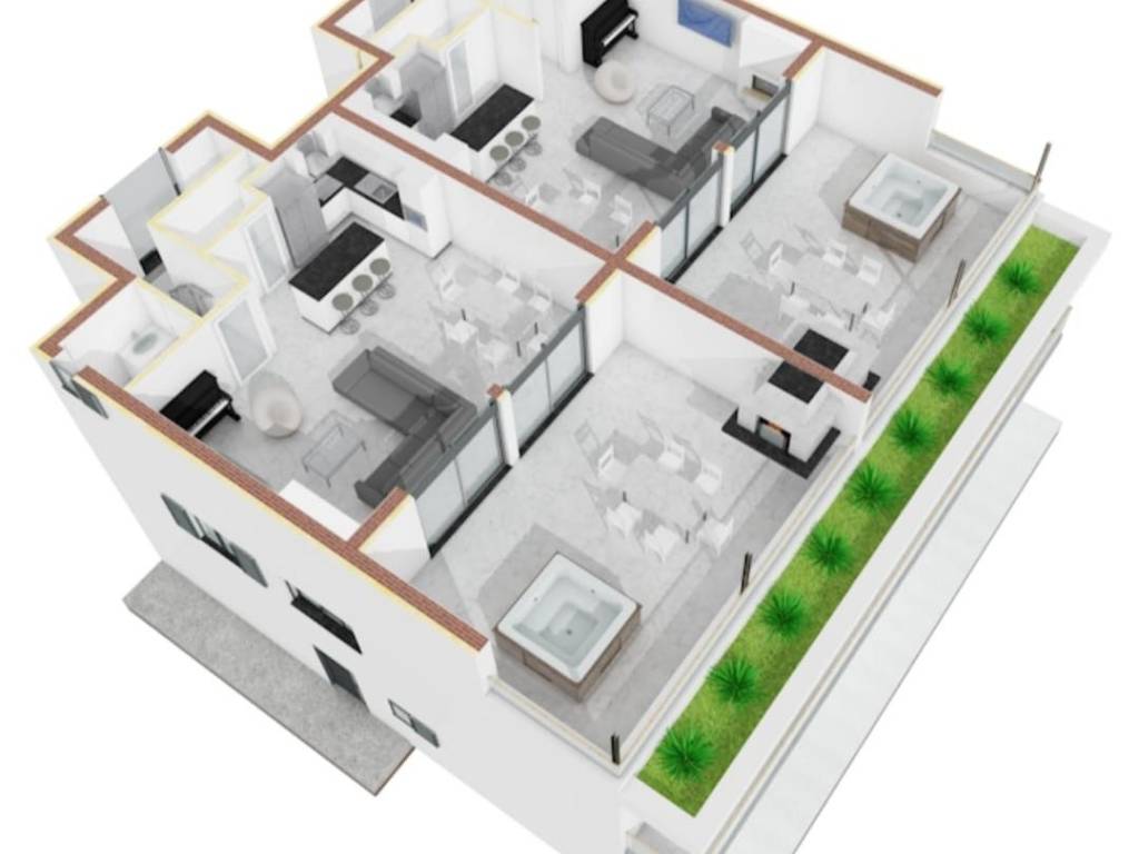 With its 166.34 m2 area, this apartment has three spacious bedrooms, two bathrooms, one of which has its own bathroom and dressing room. An internal staircase leads to the second floor, where there is an open space kitchen and dining room and a living room that leads to a spacious terrace of 40 m2, which further expands the space for enjoyment and relaxation. The terrace is designed as a space where installations for an outdoor kitchen or grill, as well as a jacuzzi, will be carried out.