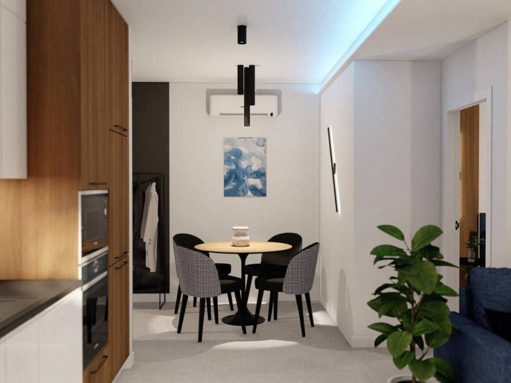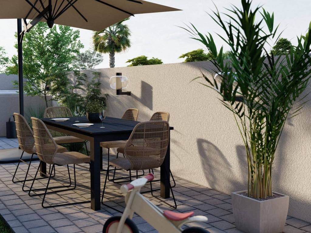 Spacious open space encompassing the kitchen, living room, and dining area. Private balcony leading to a 97 m2 garden. Two bedrooms and one bathroom. One parking space next to the garden, with the possibility of installing a covered parking space. Electric underfloor heating in the bathroom for maximum comfort. Air conditioning units for heating and cooling in the living room and bedrooms.