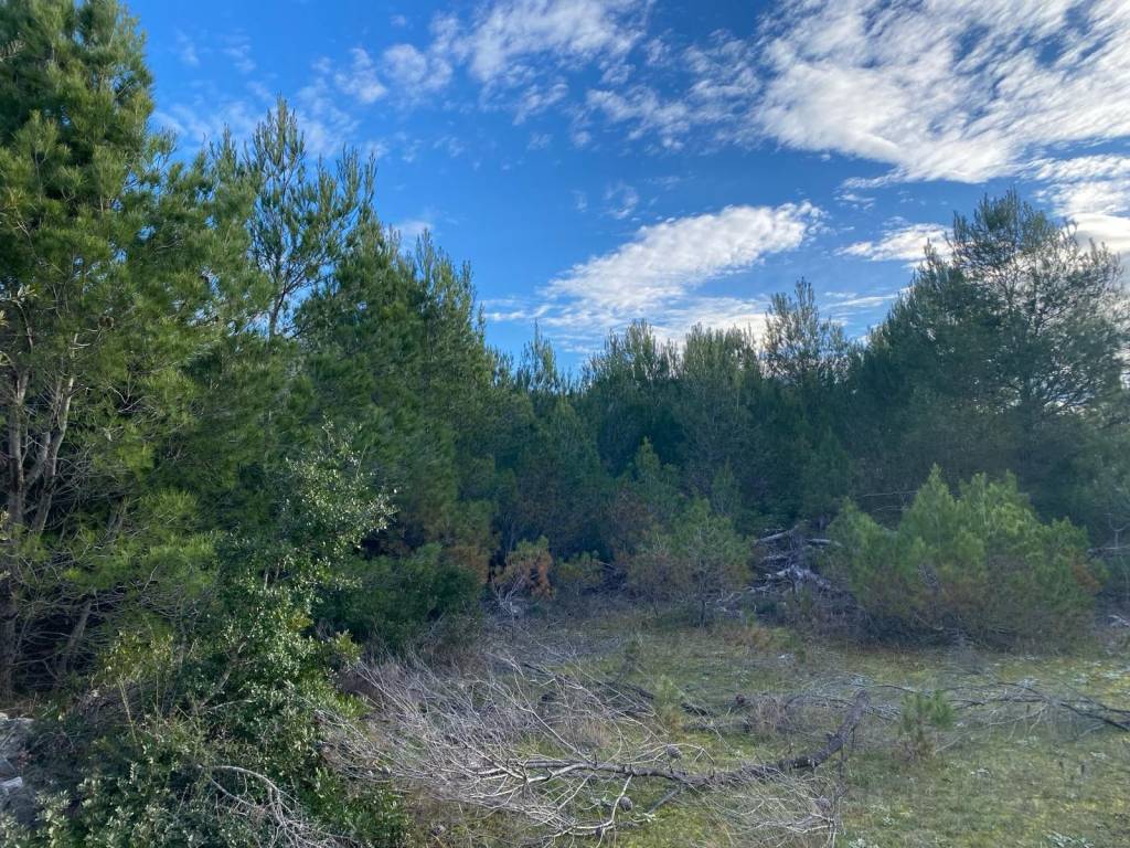 Entrance to the plot immediately from the highway. The plot is overgrown with vegetation and pine trees.