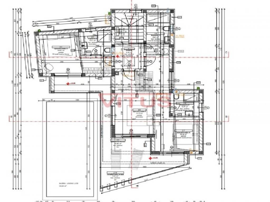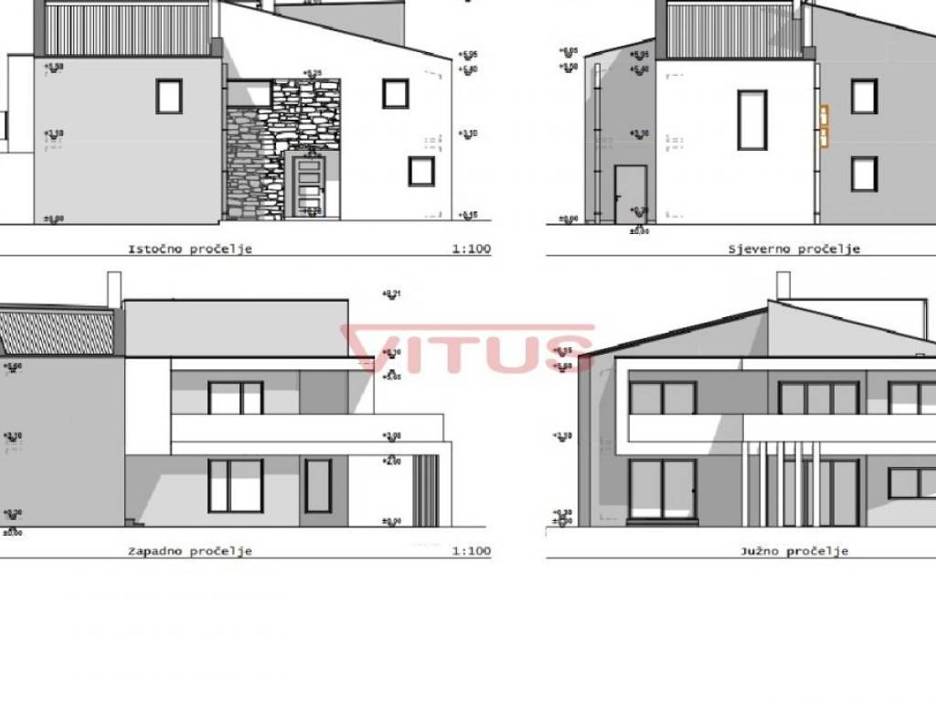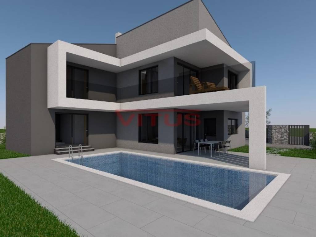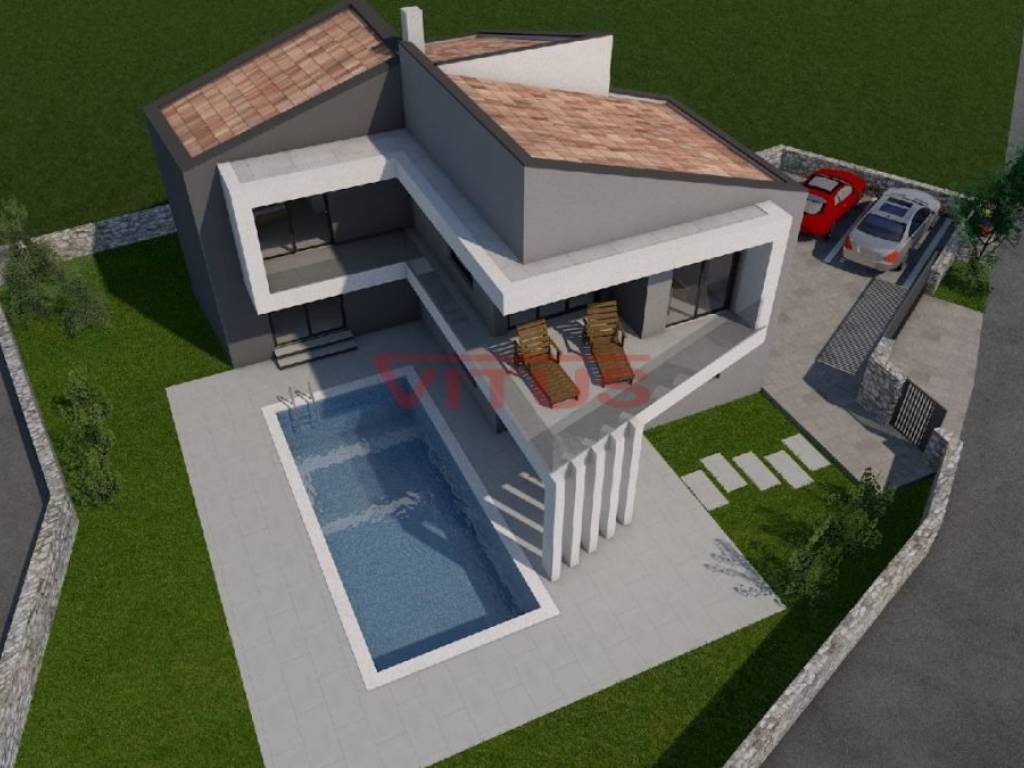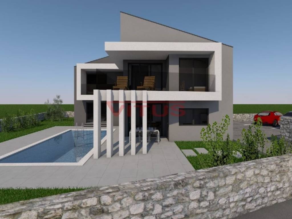 Detached modern villa with pool is located in a small village near Vrbnik. The villa is located on a plot of 706 m2 and has 175 m2 net of living space (206 m2 gross). It consists of ground and first floor. The ground floor has an entrance hall, kitchen with dining area, living room, 2 storage rooms, toilet, bedroom with bathroom and a covered terrace. Upstairs are three bedrooms, three bathrooms and a covered terrace. In the garden there is a swimming pool of 30.24 m2 and parking spaces. The villa is located in a very quiet location surrounded by a green belt, 6000 m from sea.
