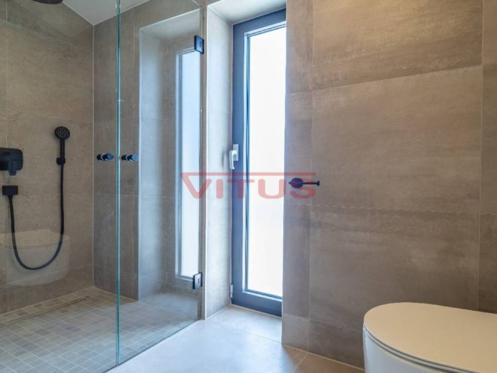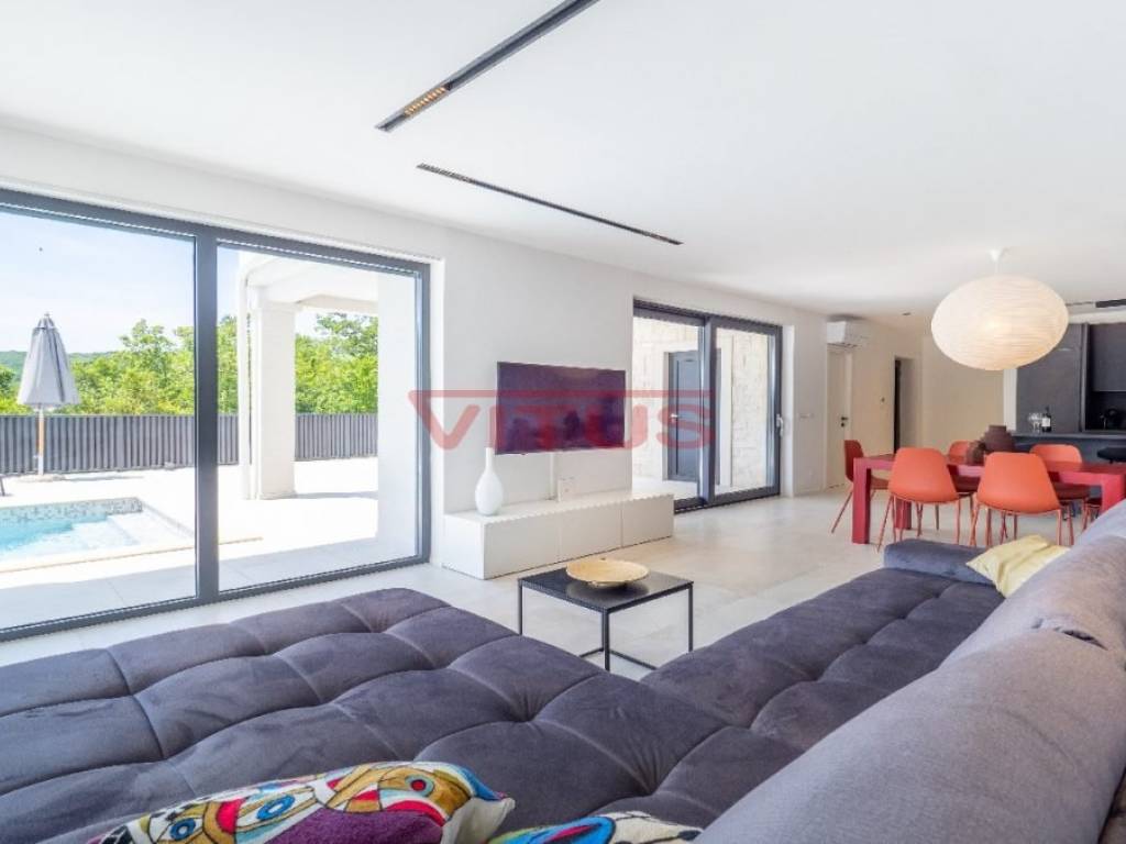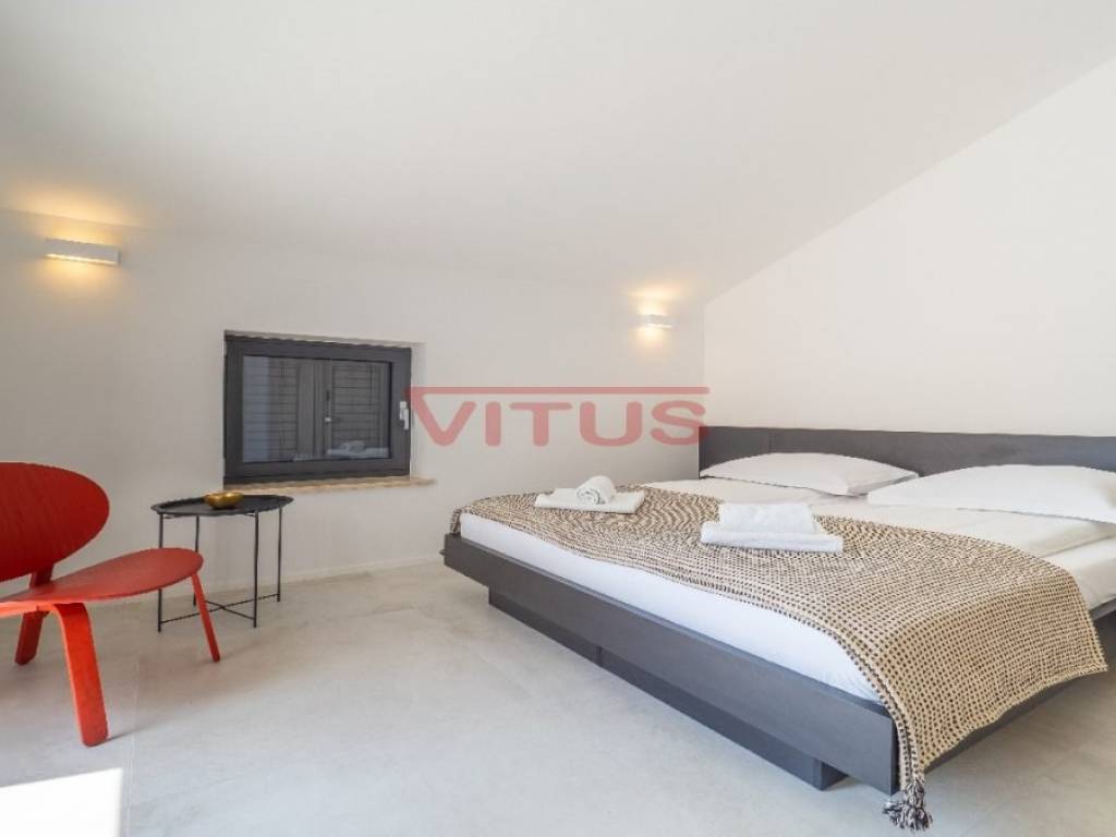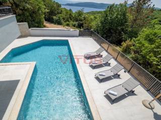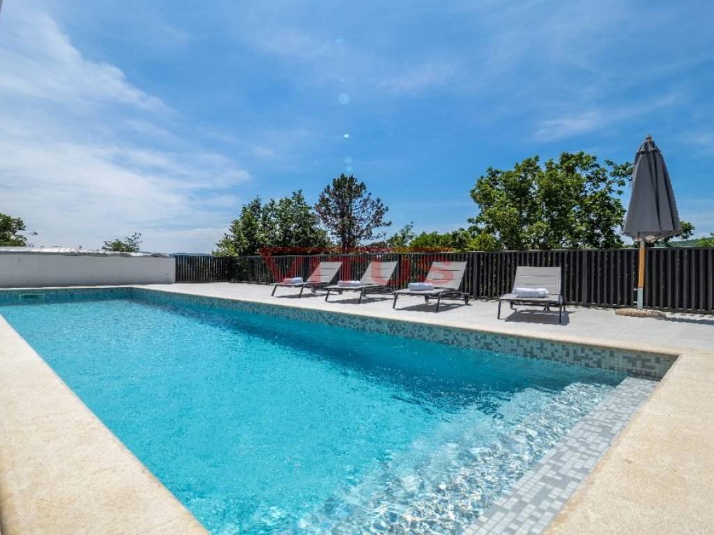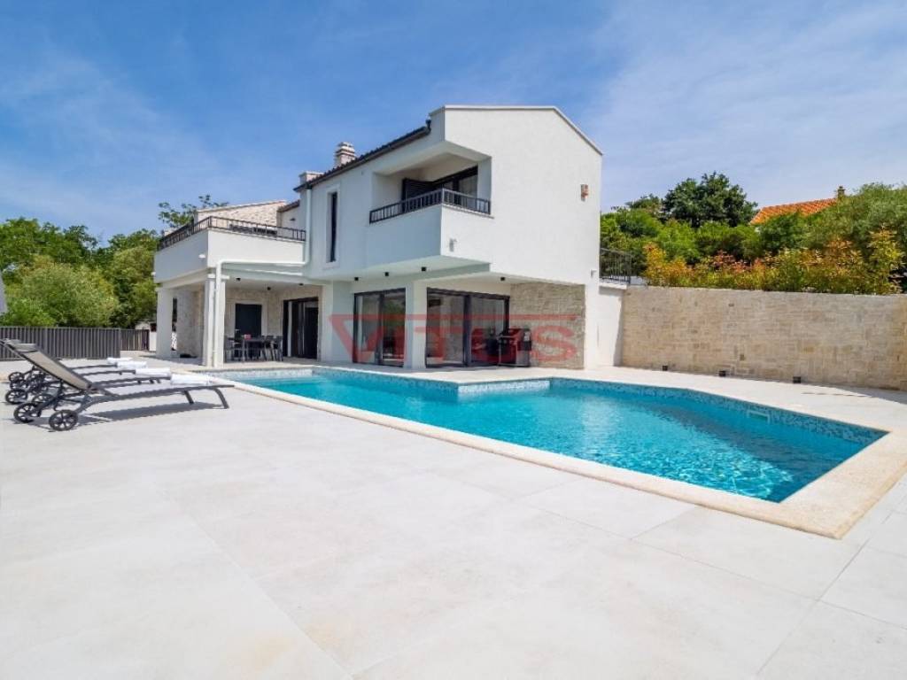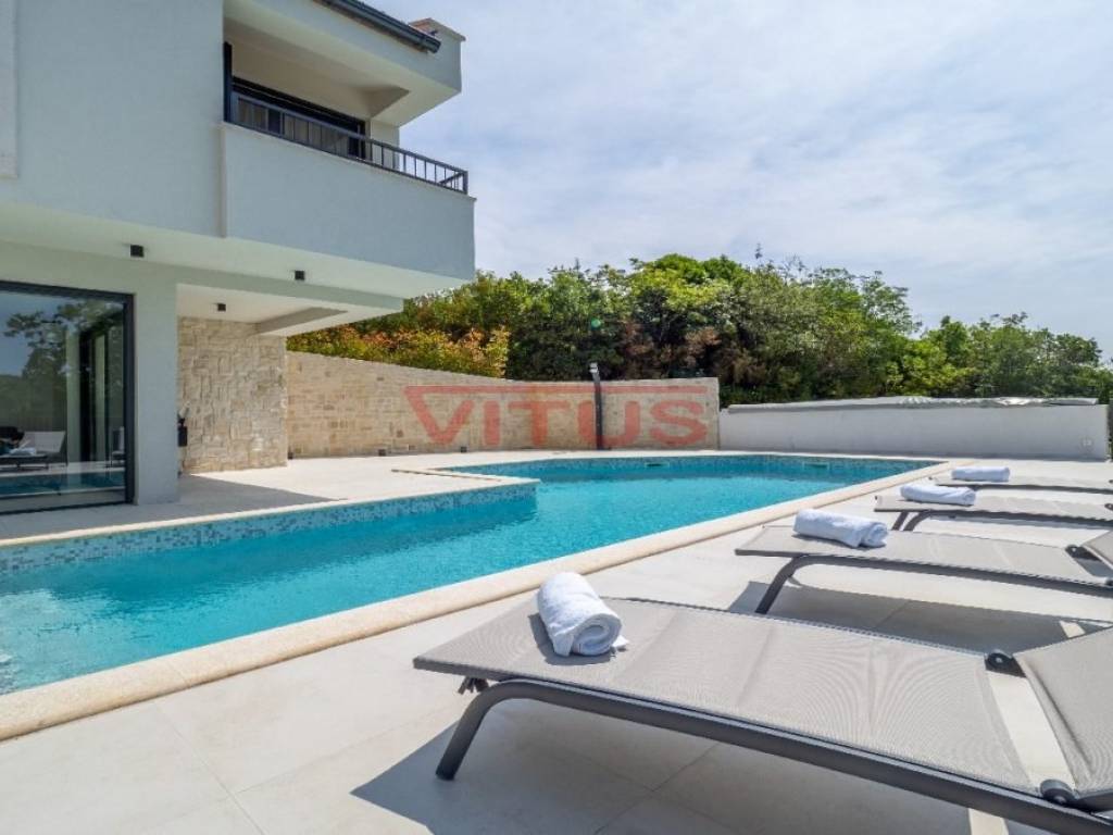 Spacious villa with pool, total living space of 118 m2, located in a quiet part of Vrbnik. It consists of ground and first floor. The ground floor has a living room with kitchen and dining area, toilet, storage room and a covered terrace. The living room has access to a covered terrace and a swimming pool with sun deck. On the first floor there are three bedrooms and three bathrooms, two of which are located in the bedrooms and one in the hallway. Access to the covered terrace have two bedrooms and one has a balcony with a lovely sea view. On the landscaped garden there is parking for two vehicles. High quality construction and equipment, air conditioned, with underfloor heating. In a green oasis, villa is 550 m from the sea.