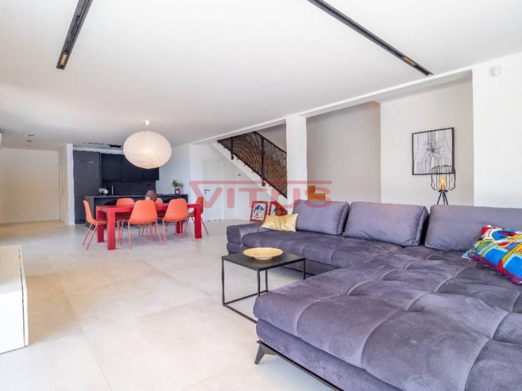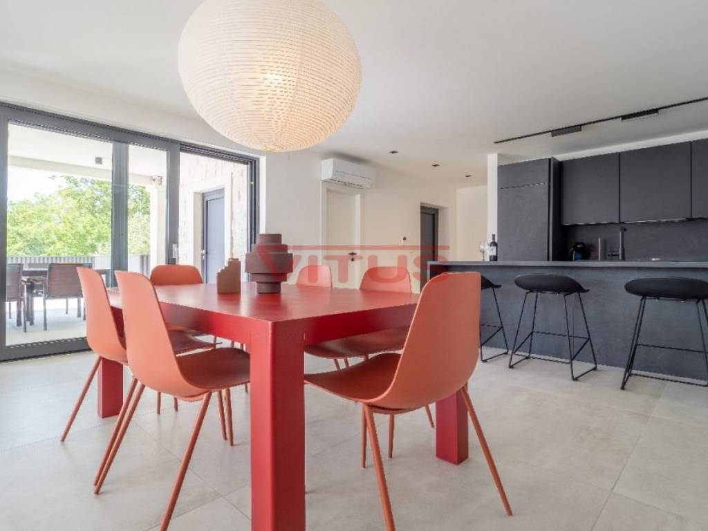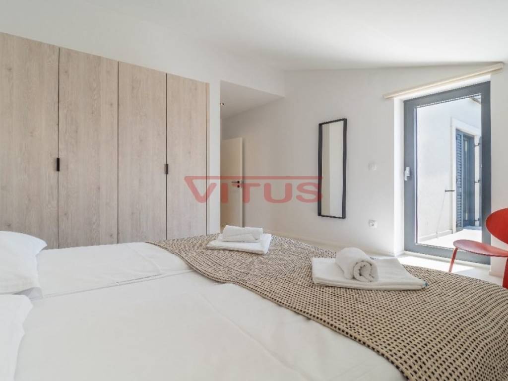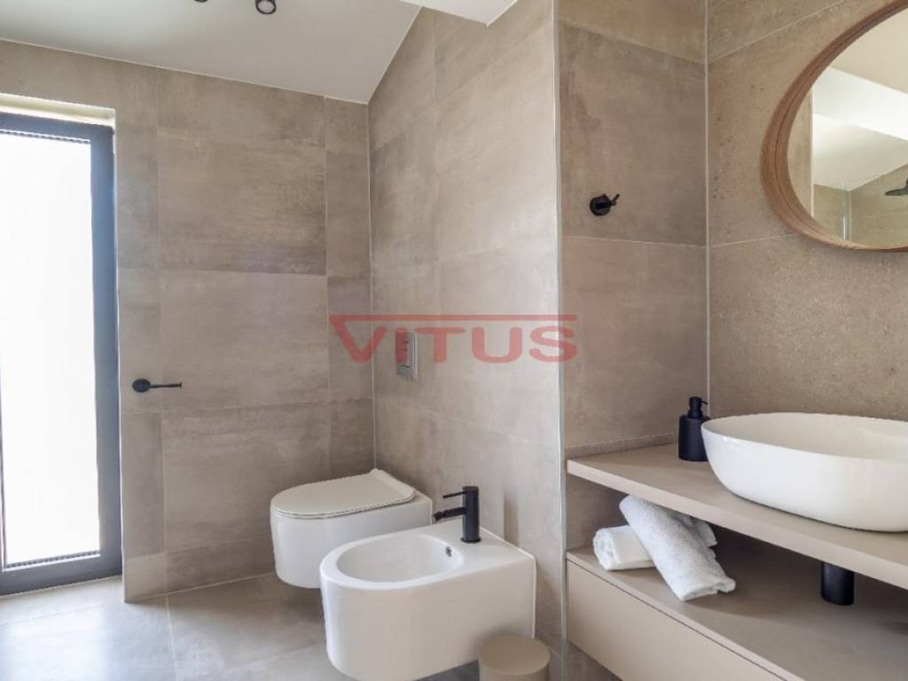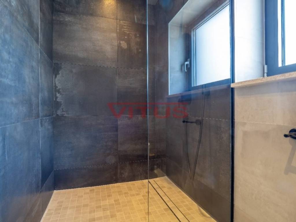 Spacious villa with pool, total living space of 118 m2, located in a quiet part of Vrbnik. It consists of ground and first floor. The ground floor has a living room with kitchen and dining area, toilet, storage room and a covered terrace. The living room has access to a covered terrace and a swimming pool with sun deck. On the first floor there are three bedrooms and three bathrooms, two of which are located in the bedrooms and one in the hallway. Access to the covered terrace have two bedrooms and one has a balcony with a lovely sea view. On the landscaped garden there is parking for two vehicles. High quality construction and equipment, air conditioned, with underfloor heating. In a green oasis, villa is 550 m from the sea.