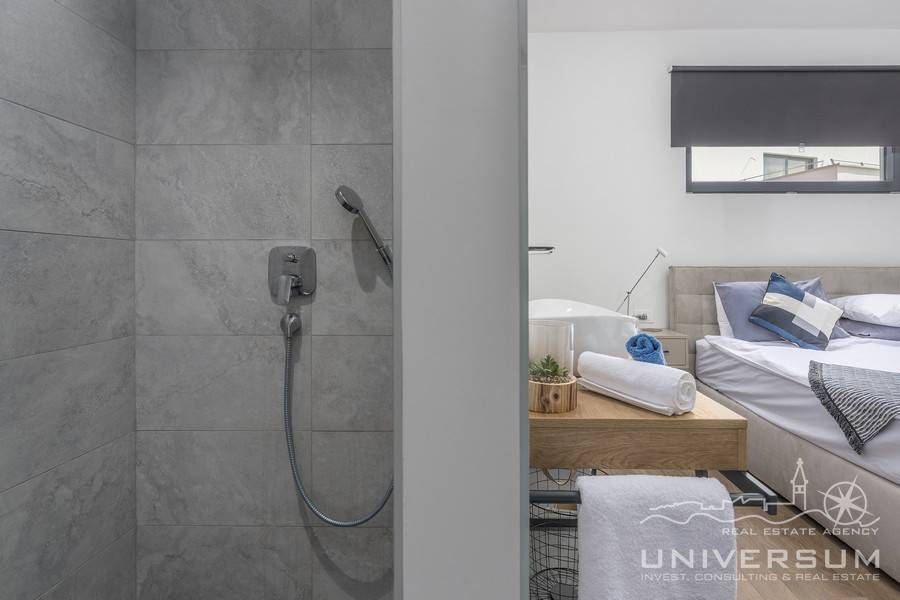 Built in 2018 on a plot of 1001 m2, this villa covers 215 m2 of usable area. It consists of a ground floor, first floor and a roof terrace. The ground floor is home to three bedrooms with en-suite bathrooms, a storage room, a boiler room and additional space that the future owner can arrange according to their wishes. The first floor is the place for another bedroom with bathroom, toilet, kitchen, dining room, living room, office and a beautiful terrace. On the roof terrace you can enjoy the hot tub and sundeck.