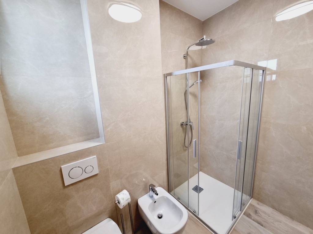 This apartment includes an entrance hall, two bedrooms, a bathroom and a kitchen that is fully equipped with all appliances, as well as a living room. Large glass walls allow plenty of light and water to the spacious covered terrace of 9m2.