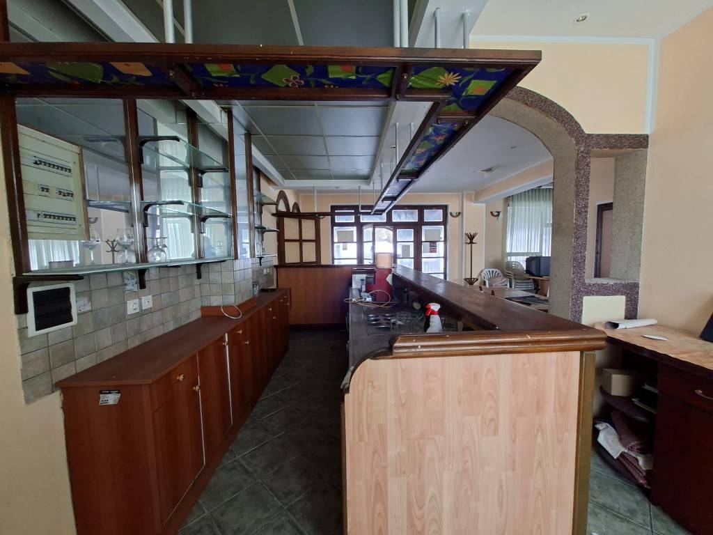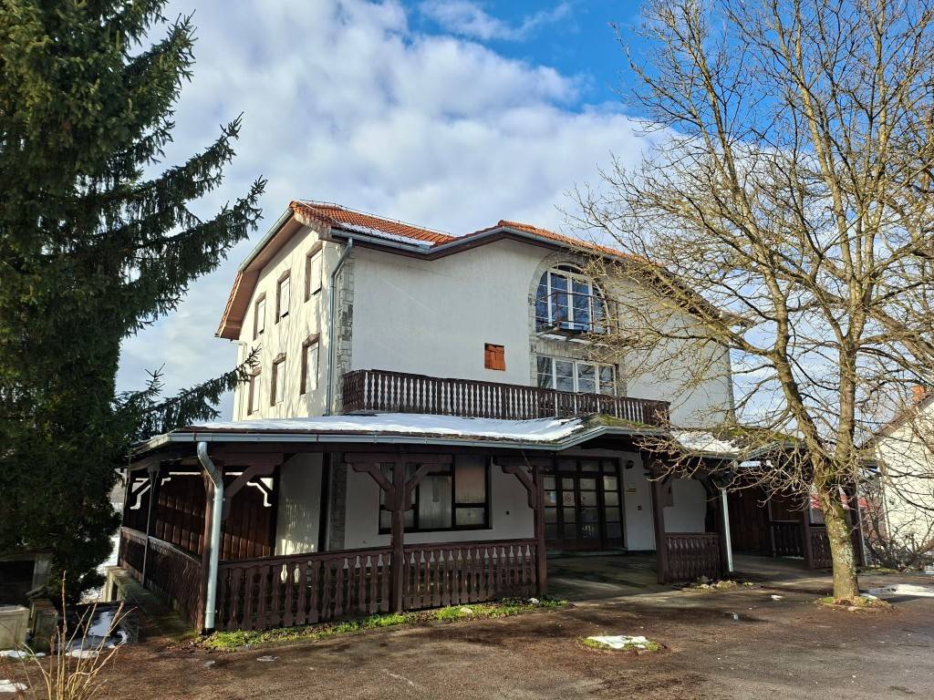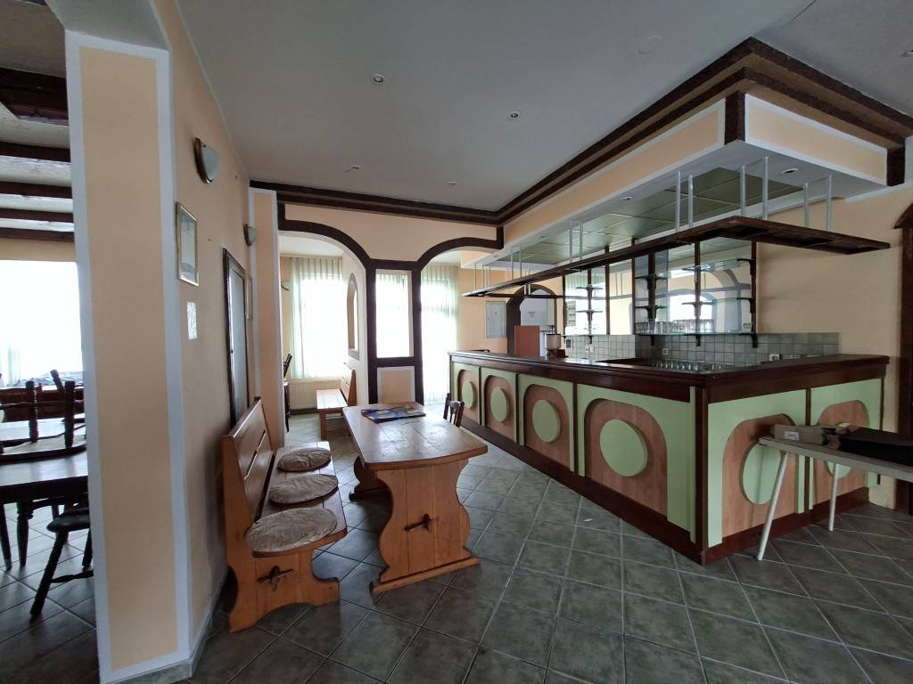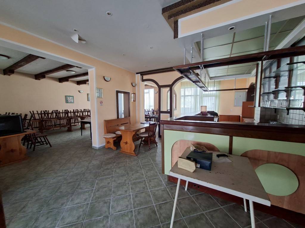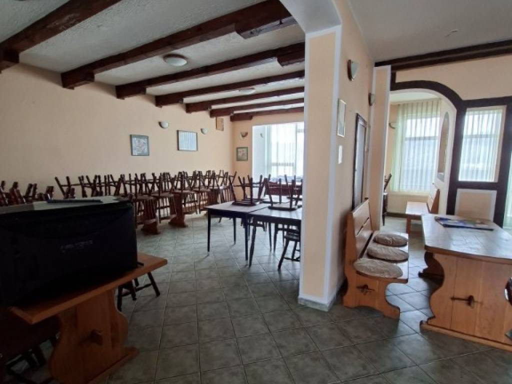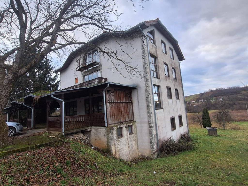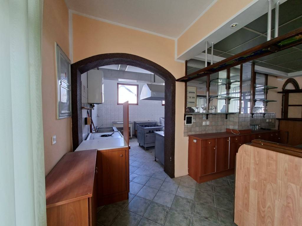 Tocrtna veličina zgrade 14,70 x 10,10 m + ugostiteljska terasa / vanjski dio / restorana cca 107 m2. Ukupna neto površina zgrade 665 m2. Zgrada se sastoji od: suterena, prizemlja i dva kata, potpuno građevinski dovršeni u dijelu suterena i prizemlja. Etaže prvog i drugog kata su nedovršeni -/ roh bau/. Pročelja su potpuno završena sa ugrađenom vanjskom stolarijom. U prizemlju, ukupne povr 224 m2 nalazi se restoran sa dva ugostiteljska prostora i inventarom te šankom, točionikom, povezano sa kuhinjom, stubištem i dvorišnim balkonom te velikom, ulaznom ugostiteljskom terasom povr 107 m2. Podovi u prizemlju i suterenu-keramika, stolarija prizemlja i suterena -drvena, kat i potkrovlje-roch bau- blok cigla, stolarija PVC. Provedena instalacija centralnog grijanja (radijatori), peć -po izboru, do sada je bila plinska cisterna, sada-samo instalacija bez peći. Suteren zgrade povr 174 m2 sadrži gospodarska spremišta za hranu, ambalažu, ugostiteljski inventar, sanitarni prostor i garderobu za osoblje , vinoteku te sanitarne prostore za goste – muške I ženske. Ovdje se nalazi još i prostor za čistačicu . U istočnom dijelu suterena je izvedena garaža za osobno vozilo, te još jedna spavaća soba. Za vertikalnu komunikaciju sa gornjim etažama i suterenom je veliko arm. bet. stubište, koje povezuje u vertikalnom smislu sve etaže u objektu. Na nivou prvog i drugog kata povr, svaki od 137 m2, izvedeni su nosivi zidovi od blok opeka sa ostavljenim otvorima za buduća vrata, odnosno planirane sobe za iznajmljivanje: 3 sobe (lijeva strana) + 2 sobe (desna strana) na svakoj etaži; ukupno 10 soba sa centralnim hodnikom i balkonom. U svim vanjskim zidovima ugrađena je PVC stolarija 2006.g. Krov: podaskano +folija; pokrov-crijep. Pokrov ugostiteljske terase-šindra. U suterenu je ulaz u prostore zgrade i garažu sa južne strane. Ulaz u prizemlju u restoran je sa sjeverne strane preko terase, dok je gospodarski ulaz i veza sa kuhinjom i točionikom te spremištima hrane i pića sa južne dvorišne strane. Struja i voda u funkciji, plaća se paušal struje te komunalija; septička- iza zgrade. Restoran je bio u funkciji do 2011.g. nakon čega prelazi u mirovanje, te mu je, sukladno tome, potrebna odgovarajuća obnova. Zgrada ima asfaltirani parking ispred restorana 15-20 mjesta. Vlasnička dokumentacija uredna, 1/1 osigurava nesmetan prijenos vlasništva, kao i mogućnost kupnje putem kredita. Rješenje o izvedenom stanju/uporabna i građevinska dozvola; sve ucrtano, upisano. Odlična lokacija, veliki parking, terasa, ugostiteljski dio, sobe za iznajmljivanje, ukupna neto površina 665 m2- pruža mogućnost odlične investicije za poduzetnike i sve poduzetne te vraćanje i nadmašivanje nekadašnjeg renomea i sjaja ovog ugostiteljskog objekta. Cijena 370 000 €