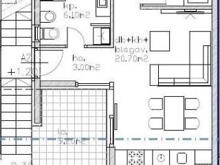 In Block A, there is an apartment with a gross area of 71.92 m2, situated on the ground floor of the villa block. The internal area of the apartment is 50.01 m2 and consists of an entrance hallway, kitchen, living room and dining area with access to the terrace, two bedrooms, and a bathroom.