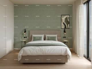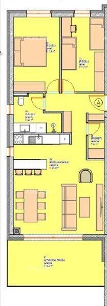 Apartment type A is located on the ground floor of a building with an elevator and consists of an entrance area, a living room with a kitchen and dining area, 2 bedrooms, a bathroom, and a large terrace. The apartment will feature underfloor heating, air conditioning, 2 private parking spaces, and a storage room.