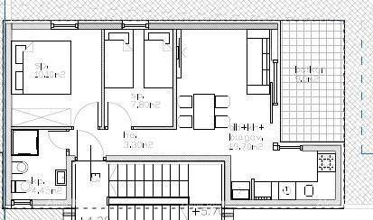 In block E, there is an apartment with an area of 66.15 m2, situated on the first floor. The interior area of the apartment is 45.35 m2 and consists of an entrance hallway, kitchen, living room and dining area with access to the terrace, two bedrooms, and a bathroom. The area of the covered terrace is 4.5 m2 (9 m2).