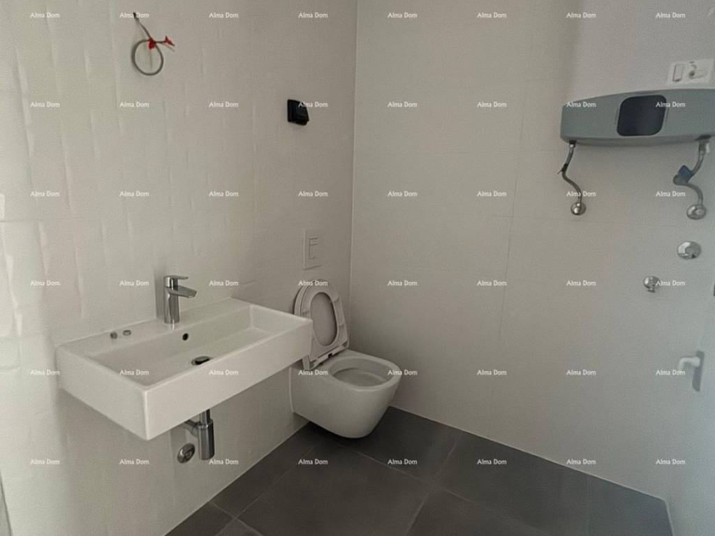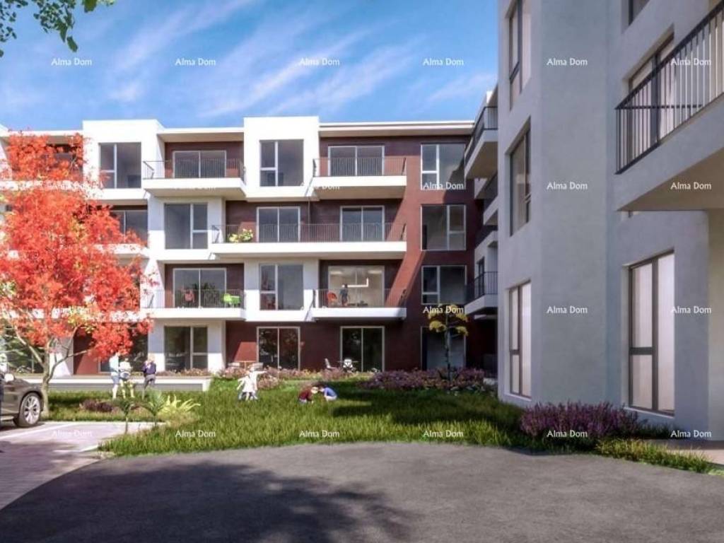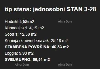 In the city of Umag, within a modern residential project comprising a total of 122 apartments, an apartment on the 3rd floor of a residential building is for sale. The apartment has a total area of 56.51 m and is designated as 3-28. It consists of a hallway, kitchen and living room, bathroom, bedroom, and a balcony of 9.98 m.