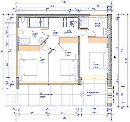 The villa has an area of 180 m, spread over two floors the ground floor includes a living room, kitchen, restroom, technical room, storage, and a covered terrace, while the first floor comprises three bedrooms, two bathrooms, a walk-in closet, and a terrace with a view.