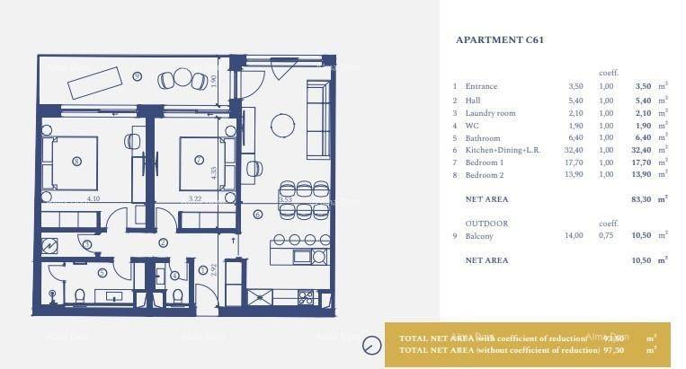 Apartment C-61 (97.3 m2) is located on the 3rd floor: The apartment consists of an entrance area, 2 bedrooms, bathroom, toilet, laundry room, kitchen, living room and dining room and balcony. The apartment is fully furnished. Private parking.