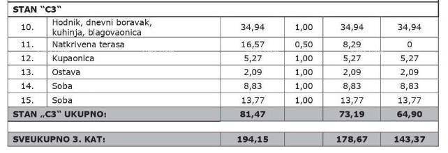 We are selling an apartment on the third floor of a new residential building in Vabriga. Apartment C3, with an area of 81.47 m (net usable area of 71.60 m), consists of a kitchen with a living room and dining area, 2 bedrooms, a bathroom, a storage room, and a covered terrace.