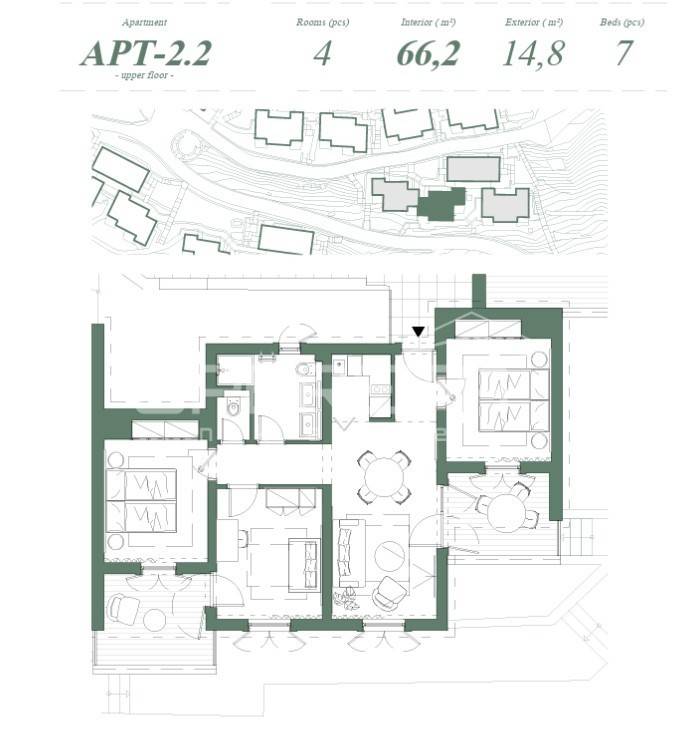 In an extraordinary location on the island of Ugljan, with a view of the city of Zadar, an apartment A 2.2. of 84.00 m2 is for sale. It is located on a small peninsula in the middle of a forest where a peaceful environment prevails, and the proximity of restaurants, cafes and shops provides additional value to the place itself. The apartment consists of a modern open space living room, kitchen, 3 bedrooms and 2 terraces with a view of the beautiful surroundings and the city of Zadar. In the next few years, investments are planned in the entire complex of the peninsula, which will increase the offer of facilities and increase the prices of apartments. The apartment is located in the T2 zone and tourist rental is mandatory. The owners participate in the rental pool from June 1st to September 30th. - during that period, they can use the apartments for 3 weeks. The rental yield of the 2025 season is estimated at 4% net. Common costs are 50 EUR/m2 per year. An outdoor pool and beach bar will open for the 2025 season.