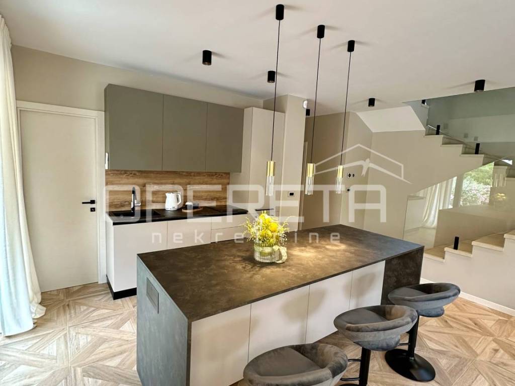 Spread across two levels, the villa has been thoughtfully designed to ensure maximum comfort and functionality. The ground floor features an entrance hall, guest toilet, laundry room, and boiler room. The heart of the home is a spacious open-concept living area with a kitchen and dining room, seamlessly connected to a large terrace with a seating and sunbathing area, located right next to a beautiful swimming poola perfect spot for relaxation on warm days.