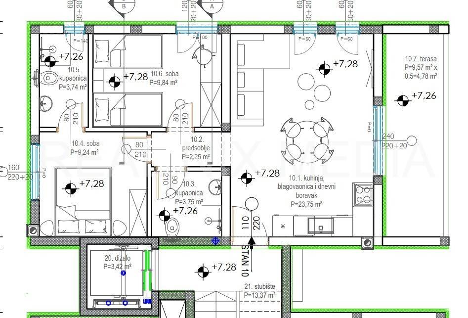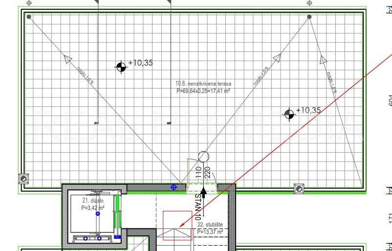 Stan površine 82,38 m, osim izuzetno funkcionalnog tlocrta i vrhunske opremljenosti, uključuje i privatnu krovnu terasu površine čak 69,64 m, idealnu za uživanje u panoramskom pogledu, opuštanje ili zabavu na otvorenom.