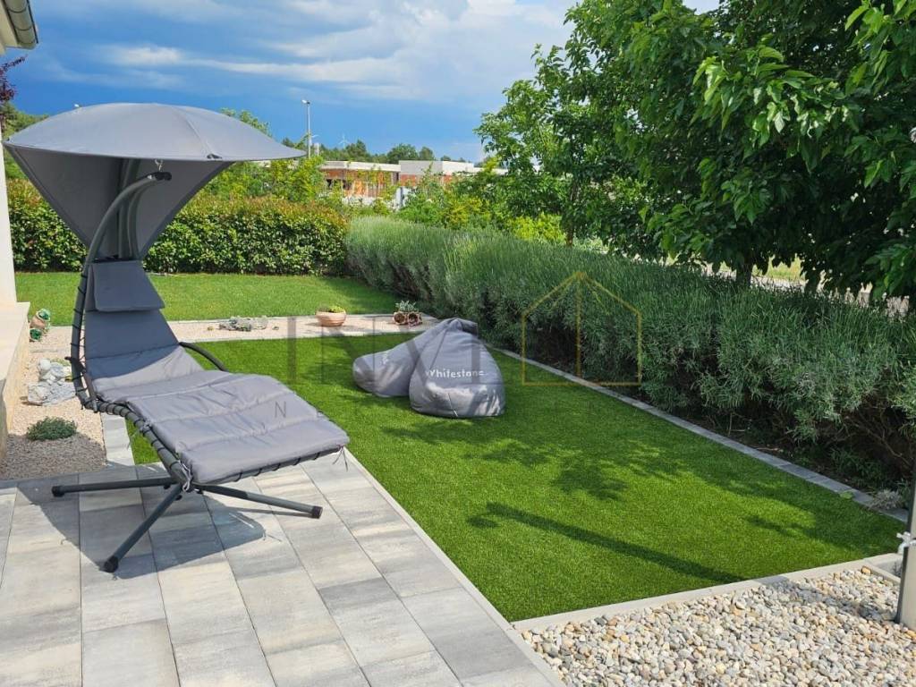 The landscaped and fenced yard offers complete privacy and a perfect place to relax. There is a hydromassage pool, deck chairs, barbecue, outdoor shower, parasol, well-maintained lawn and an automatic irrigation system. The villa has a garage and several private parking spaces, and part of the garden can be arranged as a sports field.