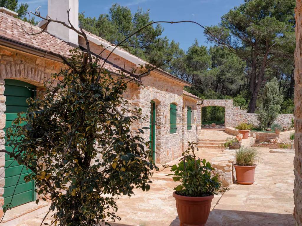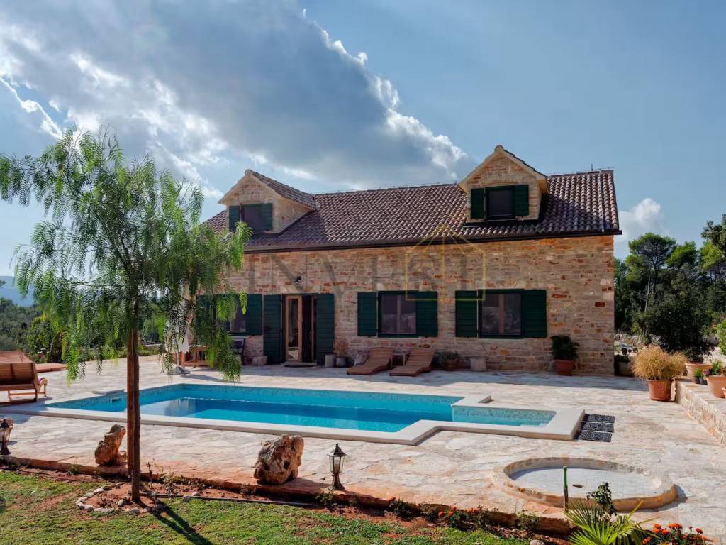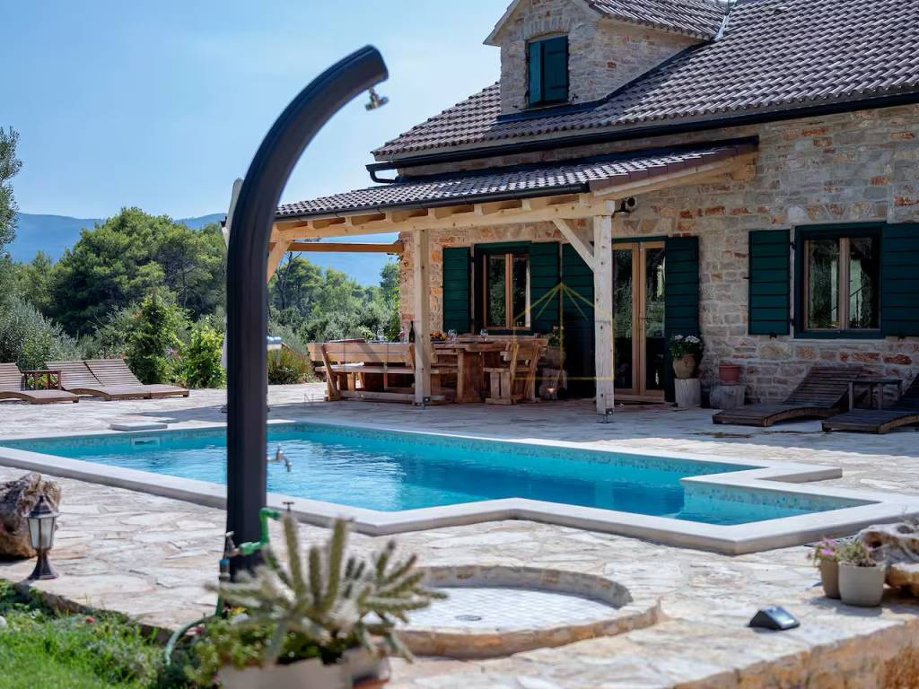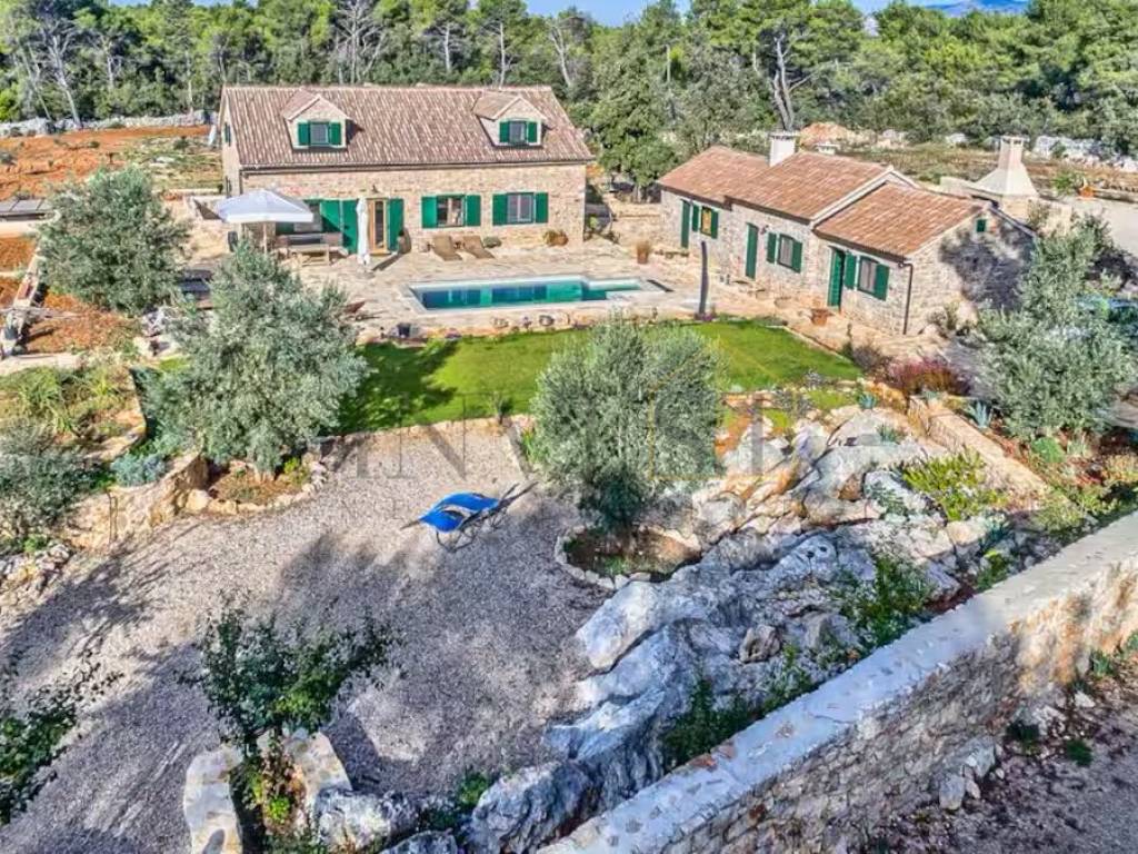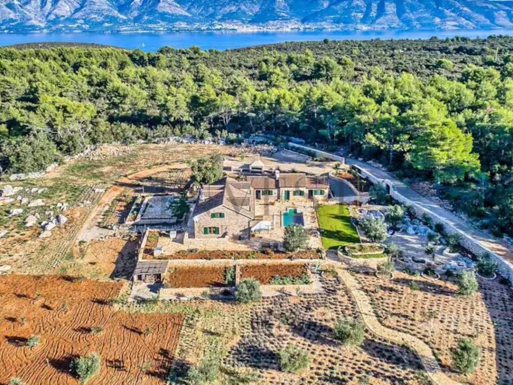 A stone villa for sale on the island of Hvar, situated in a quiet location surrounded by Mediterranean nature, on a plot of approximately 8,500 m. The property consists of a main house, three auxiliary buildings, a swimming pool and a landscaped garden.