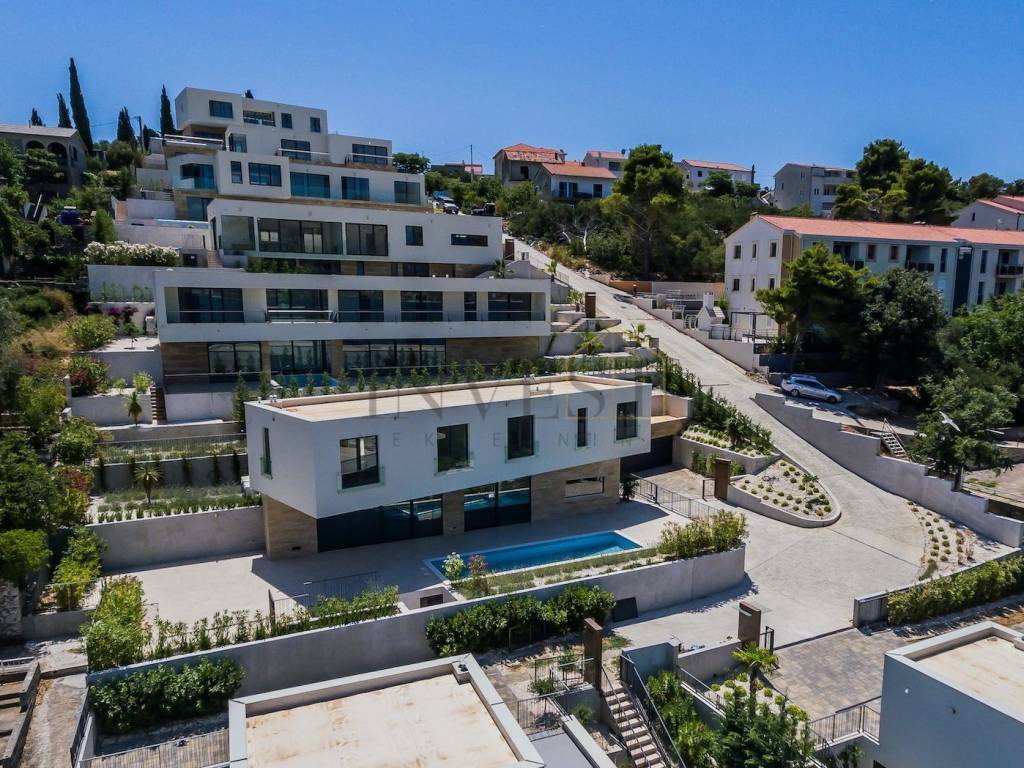 We mediate the sale of a beautiful modern, luxurious Villa in Čiovo. The villa is located in a concept of 8 villas. With an area of 326 m2 and a garden of 700 m2, where there is a heated overflow pool with a sunbathing area, a lawn... Interior of Villa VIII. consists of an entrance area, airy living room with dining room, five bedrooms and five bathrooms. The floors are connected by internal stairs. On a beautiful plot with an open view of the sea. They own three outdoor parking spaces. All villas in the complex have access to the sea. The villa has a garage, an elevator and is fully air-conditioned. All information on mobile. +385 (0)95 5759 100 (Luka) or luka@investnekretnine.com