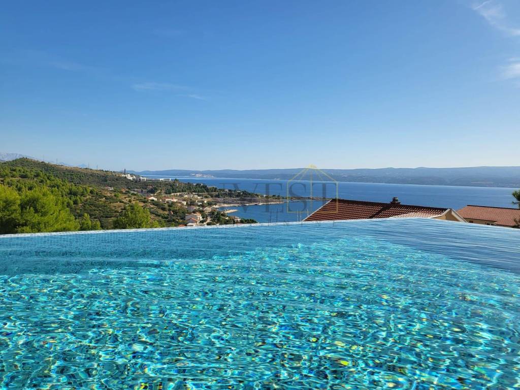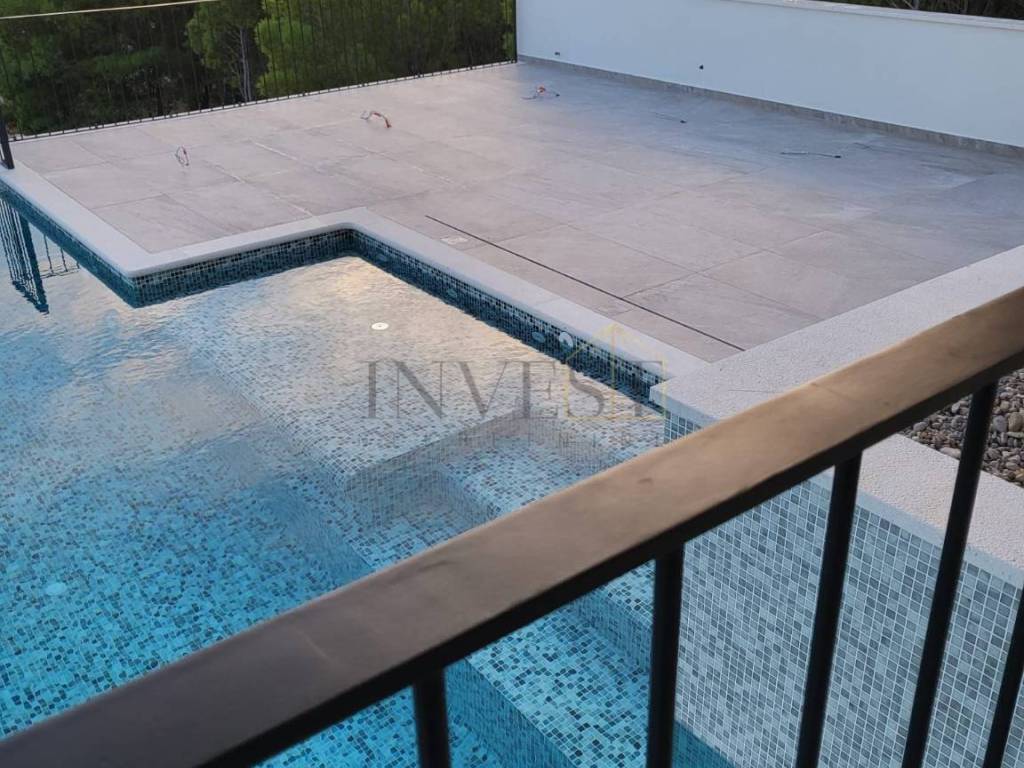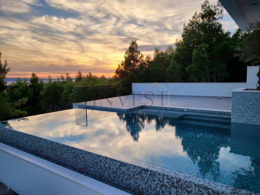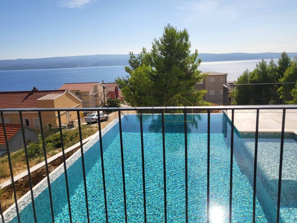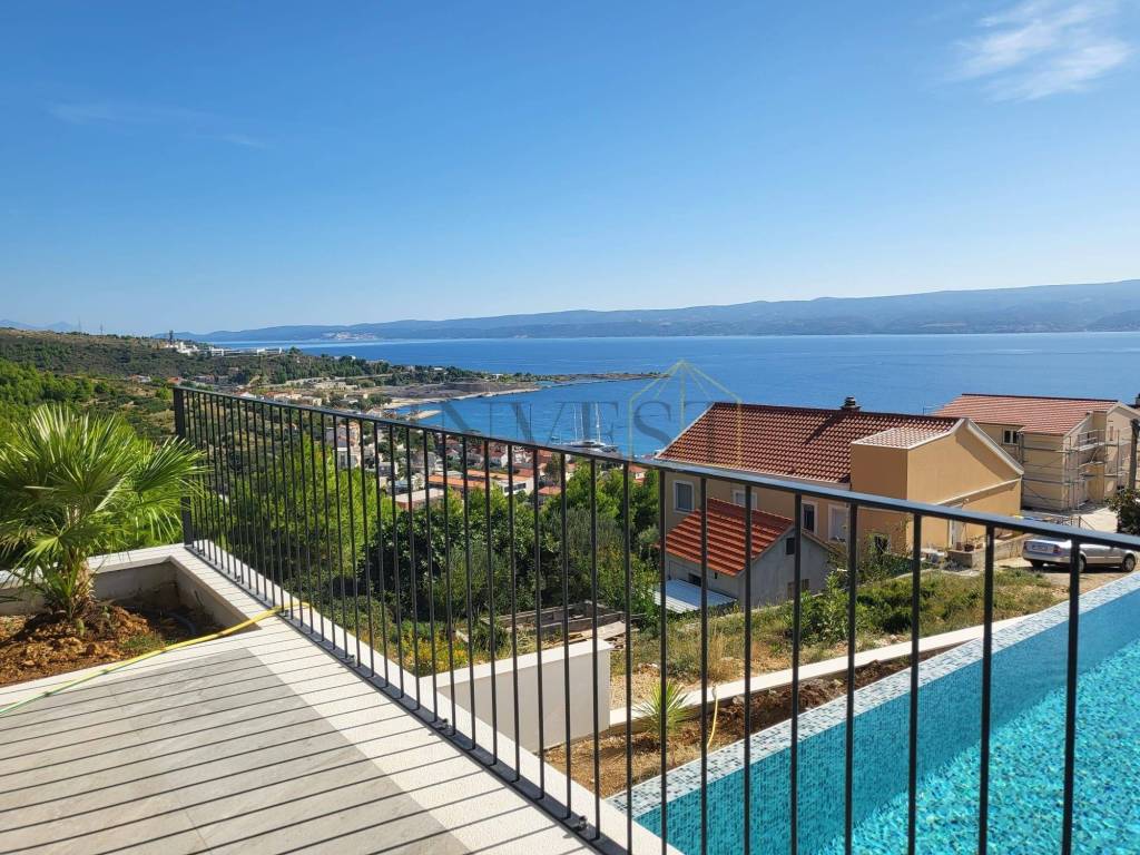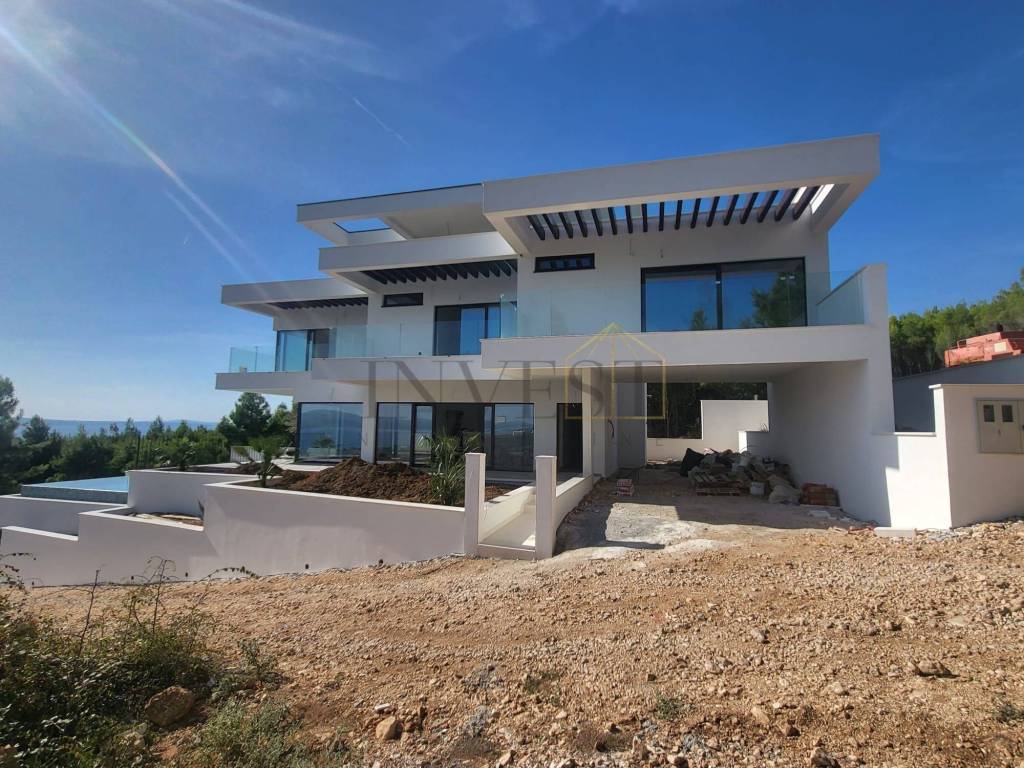 For sale is a modern detached villa in Dugi Rat in Split-Dalmatia County with a beautiful panoramic view of the Adriatic Sea. The villa is a two-story house from 2025, with a total living area of 382 m on a plot of 575 m and is ideal for family life or investment.