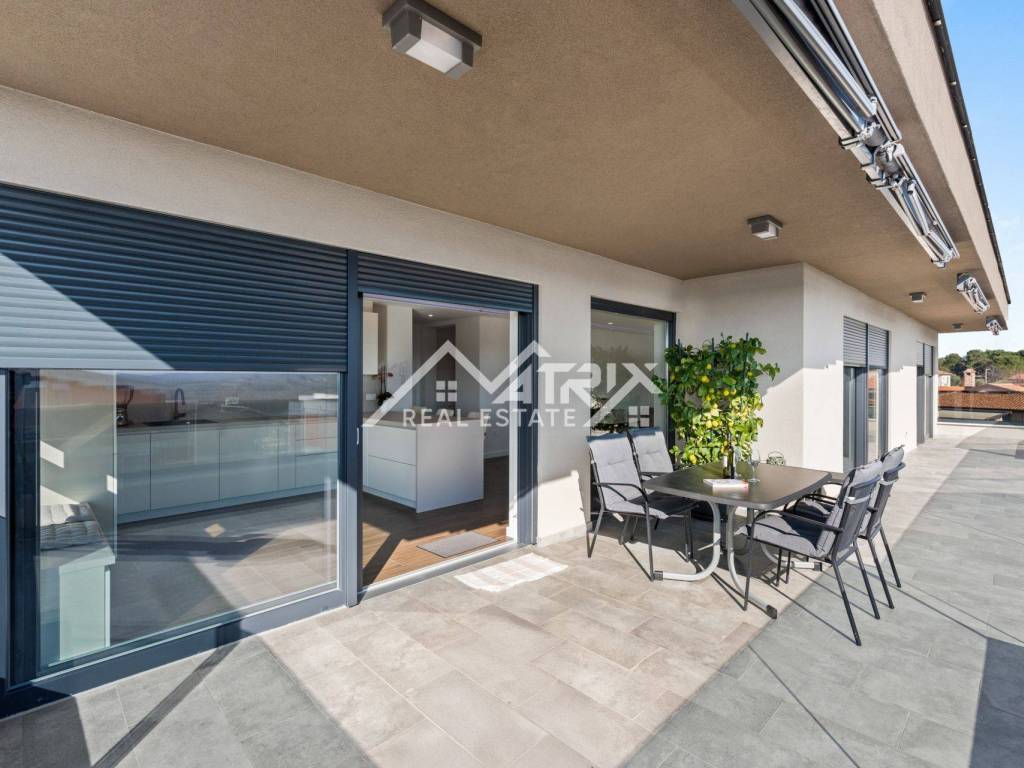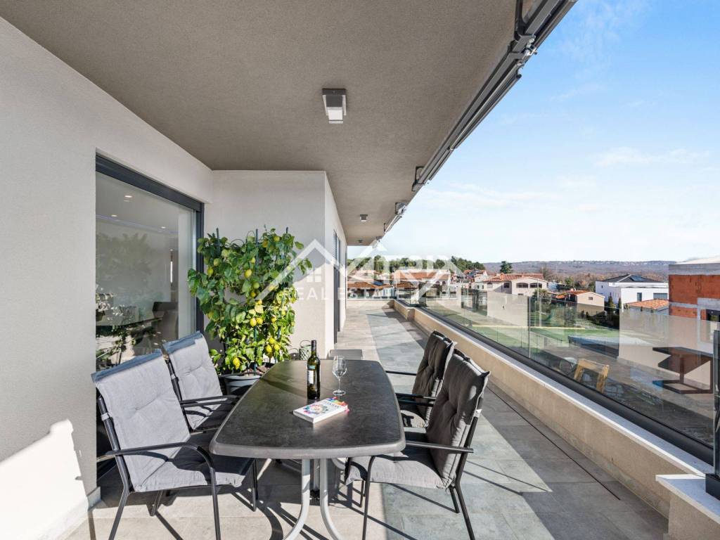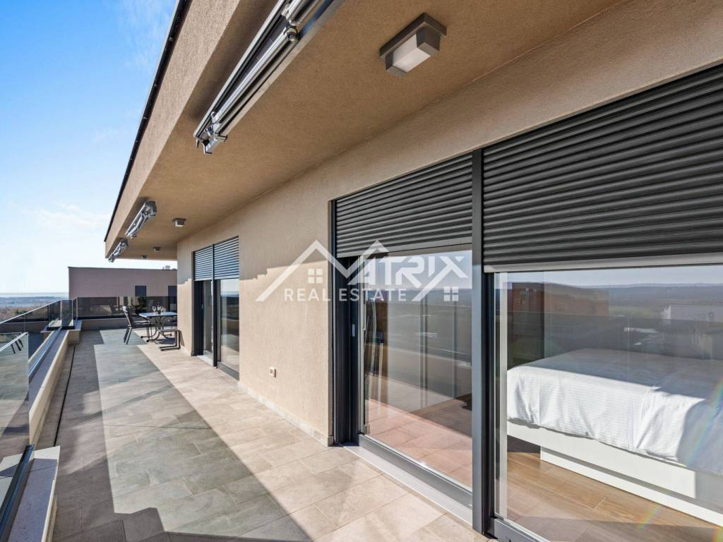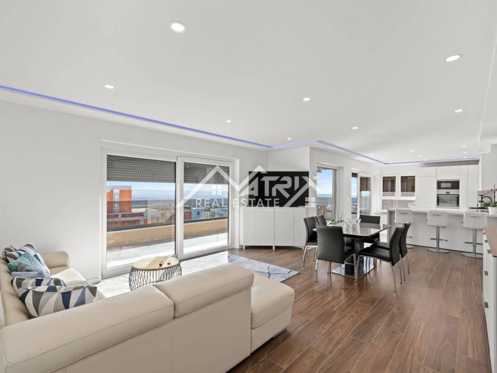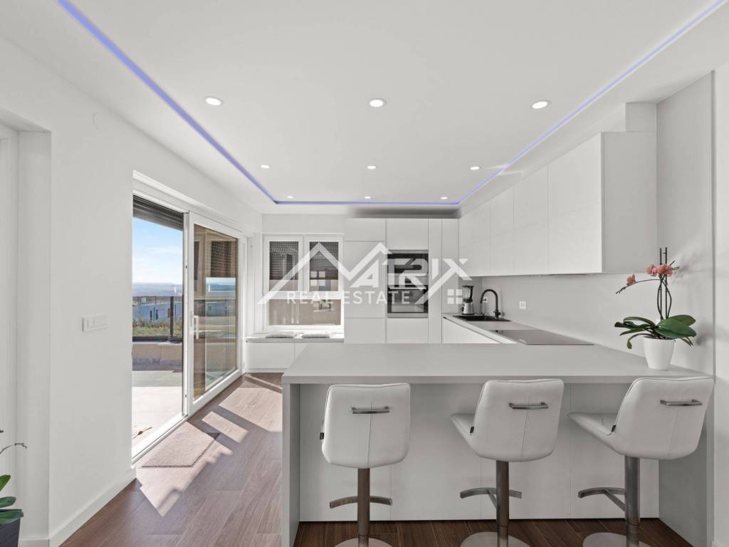 The apartment is situated in a newly built, modern building on the second floor, offering an impressive panoramic view. With 105 m², it features an open-space living room, kitchen, and dining area, three spacious bedrooms, each with its own elegant bathroom, and one bedroom with access to a large, sunny terrace. Thanks to large glass walls, the apartment is filled with natural light, while the living room and kitchen open onto a spacious terrace with a breathtaking sea view.