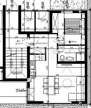 GROUND FLOOR APARTMENT MARKED "A1" (48.70 m2) includes: entrance hall, living room + kitchen + dining room with access to a covered terrace, bedroom and bathroom.