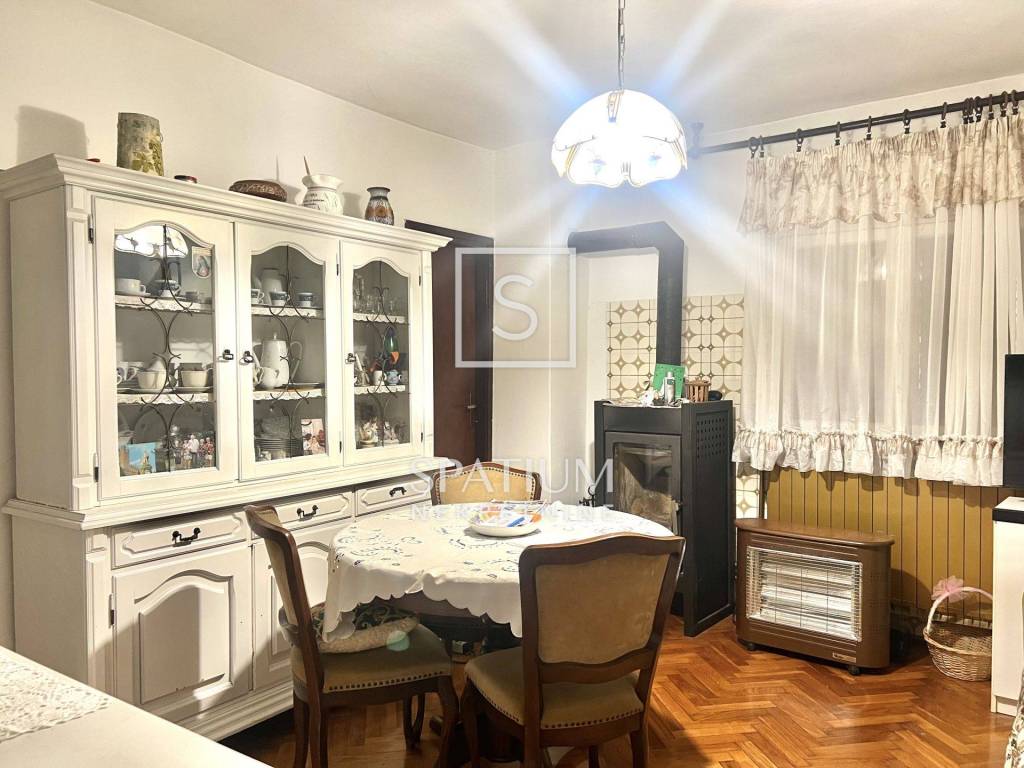 Heating is provided by a central wood-burning stove system, with an additional independent stove on the ground floor.