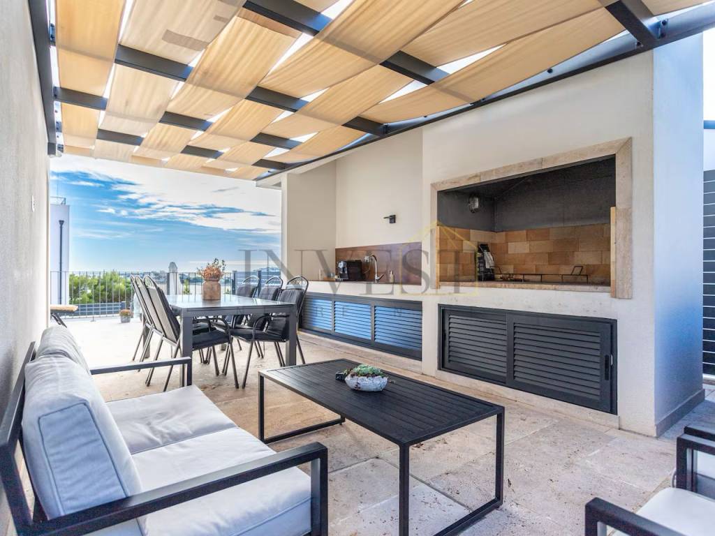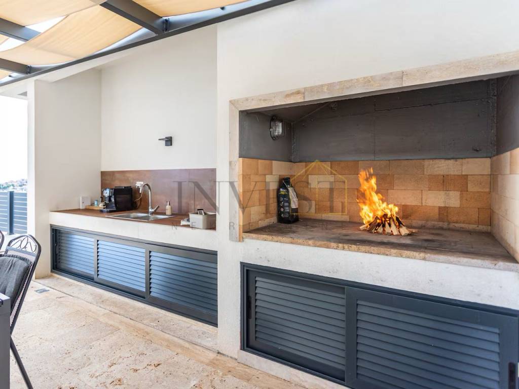 The ground floor of the villa includes a spacious living room with a kitchen and dining area in an open-space concept, a guest bathroom and a storage room. The ground floor leads to a courtyard that is decorated for year-round enjoyment, including a private pool, an outdoor summer kitchen, a dining area and a barbecue.