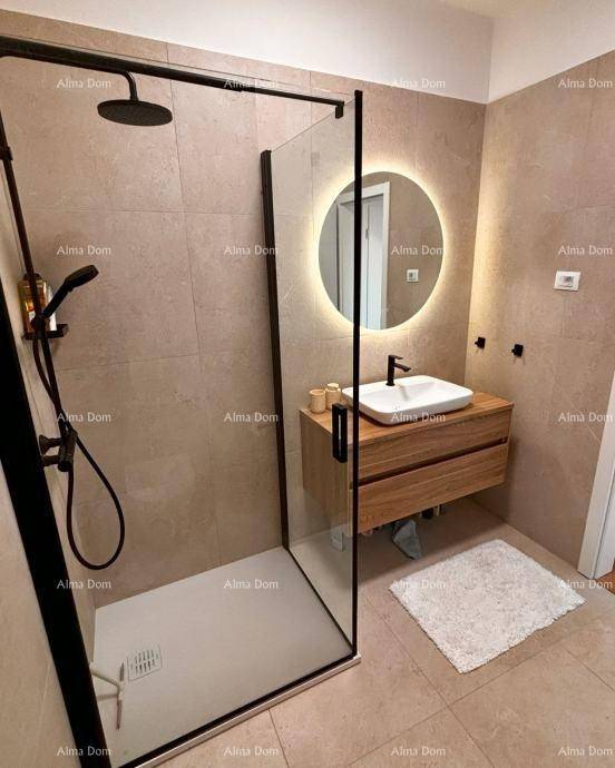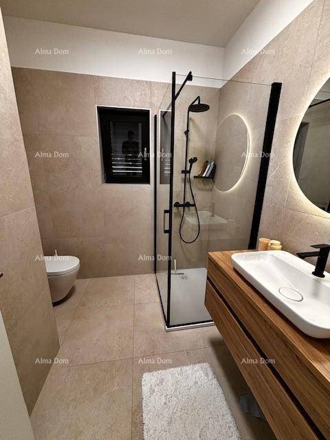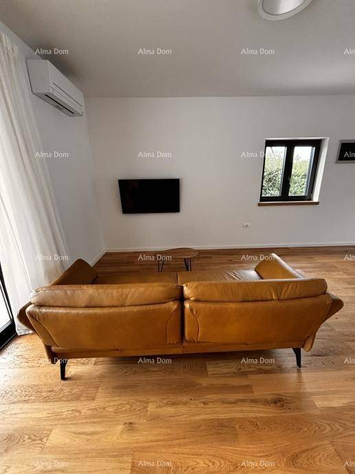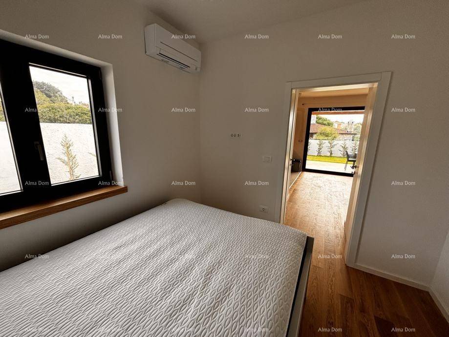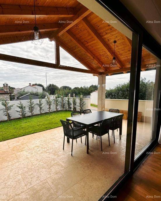 The house is equipped with underfloor heating throughout the interior, controlled via a modern mobile thermostat. Two Mitsubishi A++ air conditioning units are installed for heating and cooling. The windows are PVC Deceuninck profiles, with lift mosquito nets and aluminum sliding shutters. Full stone sills surround the windows, and the three-color roof tiles contribute to the traditional Istrian appearance of the house.