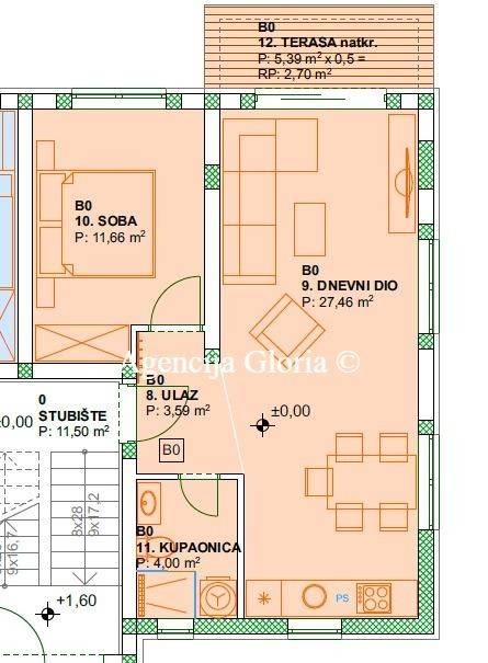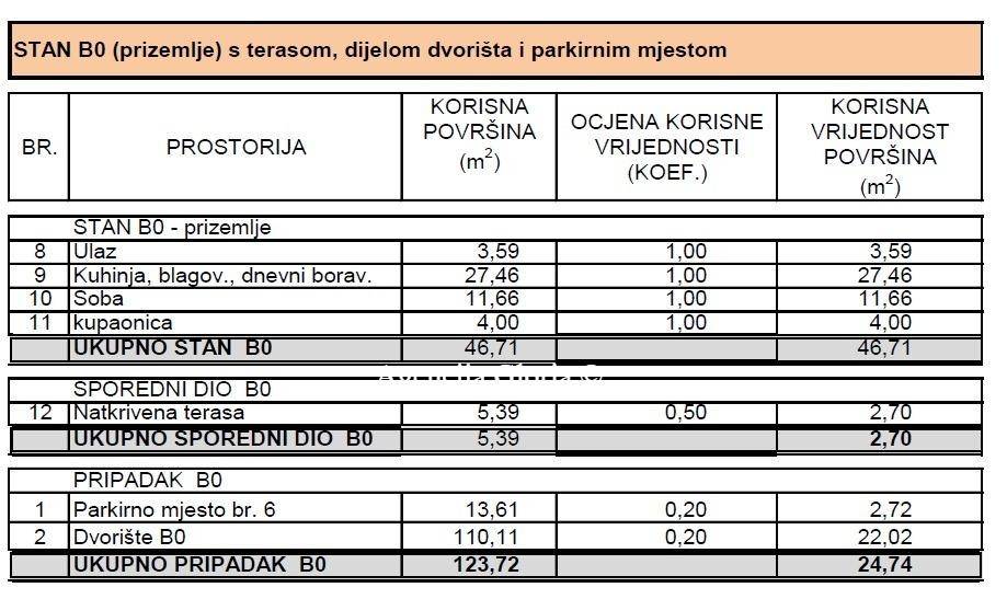 Prodaje se komforan jednosobanapartman smješten u prizemlju stambene zgrade neto površine 74,66m2. Stambena površina apartamana iznosi 49,41m2. Sastoji se od: ulaza površine 3,59m2, kuhinje+blagovaonice+dnevnog borakva površine 27,46m2, spavaće sobe površine 11,66m2, kupaonice površine 4,00m2 i natkrivene terase površine 5,39m2 brutno odnosno 2,70 m2 neto. Pripada mu parkirno mjesto površine 13,61m2 bruto i vrt bruto površine 110,11m2.