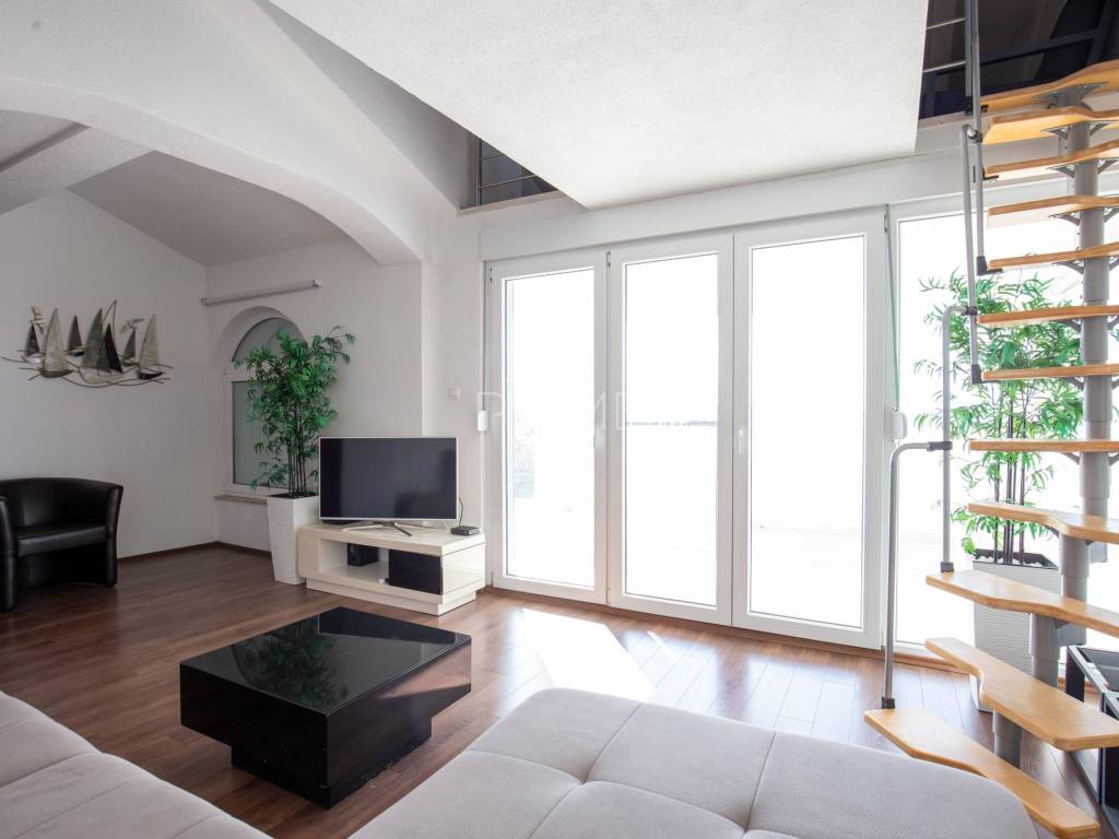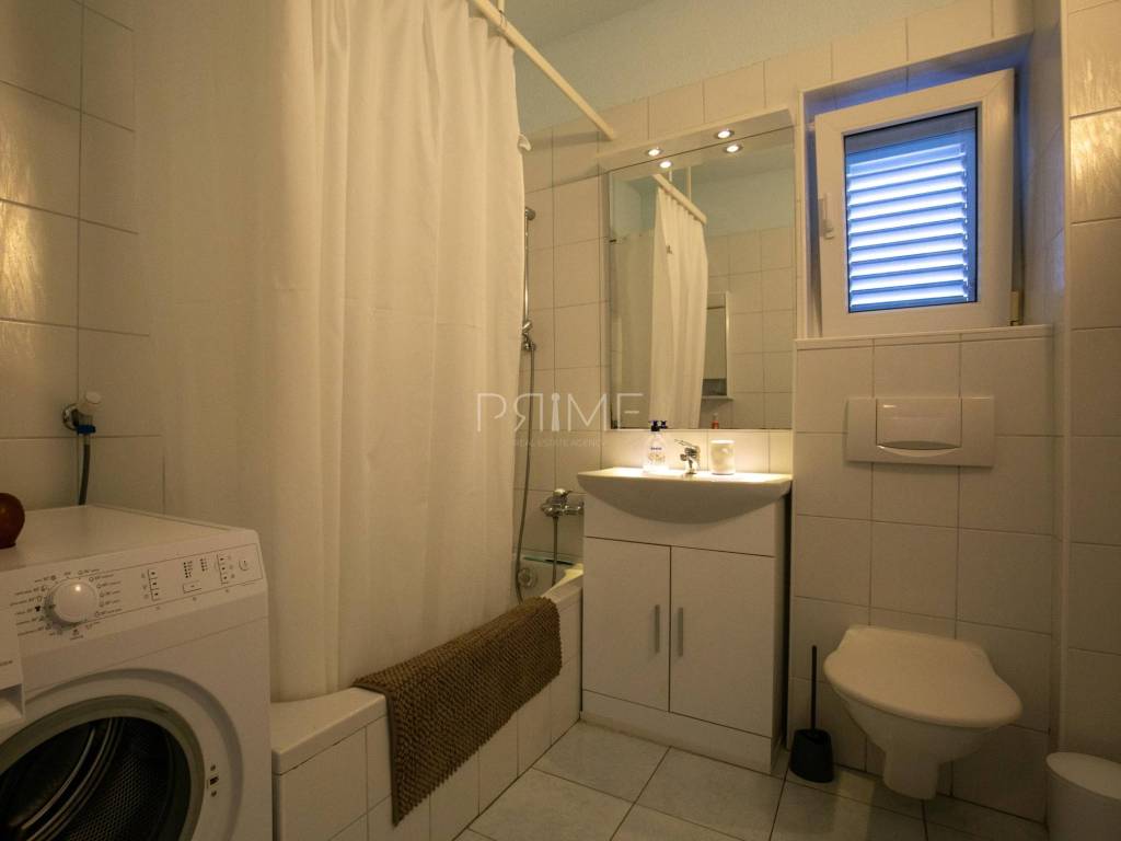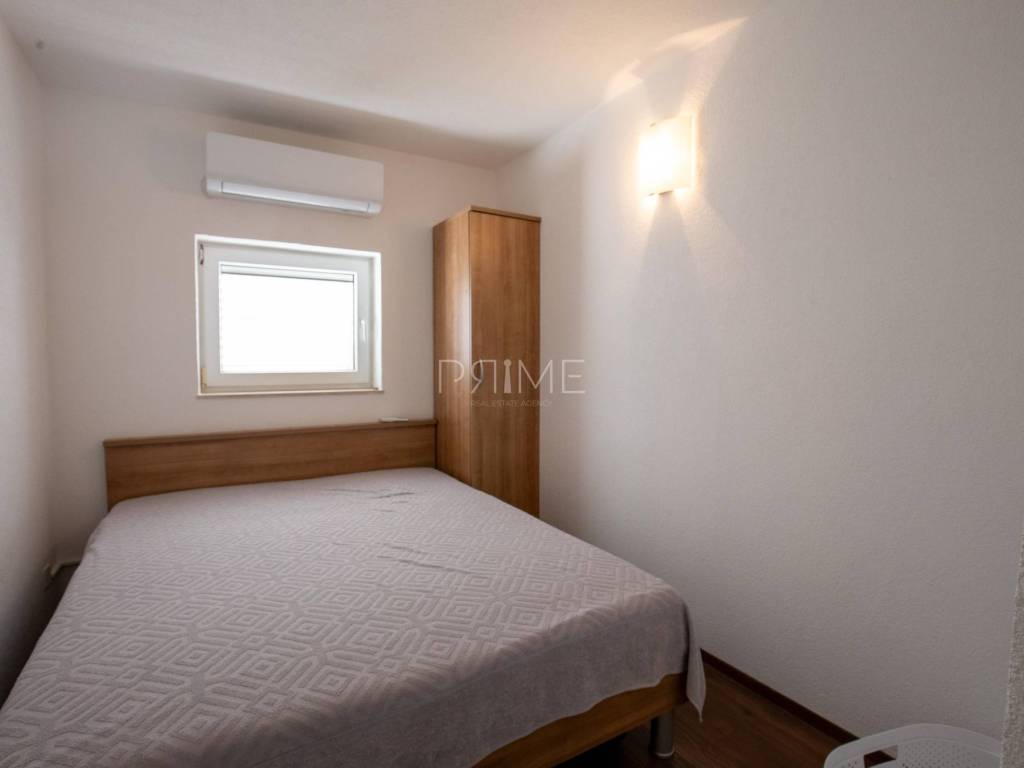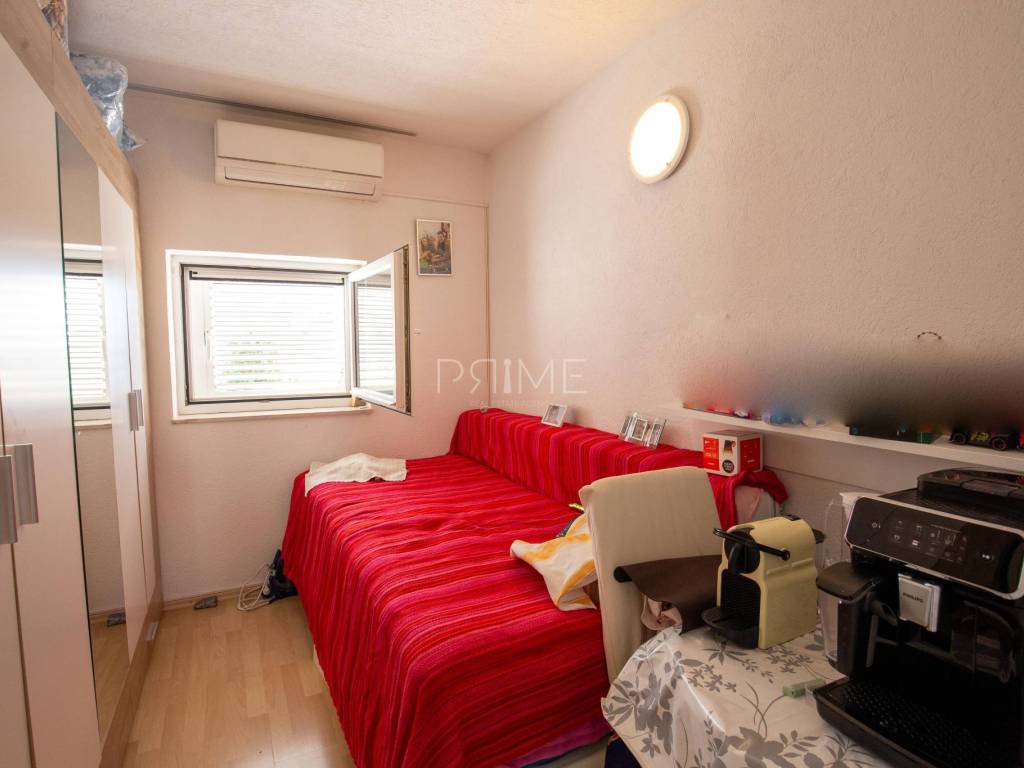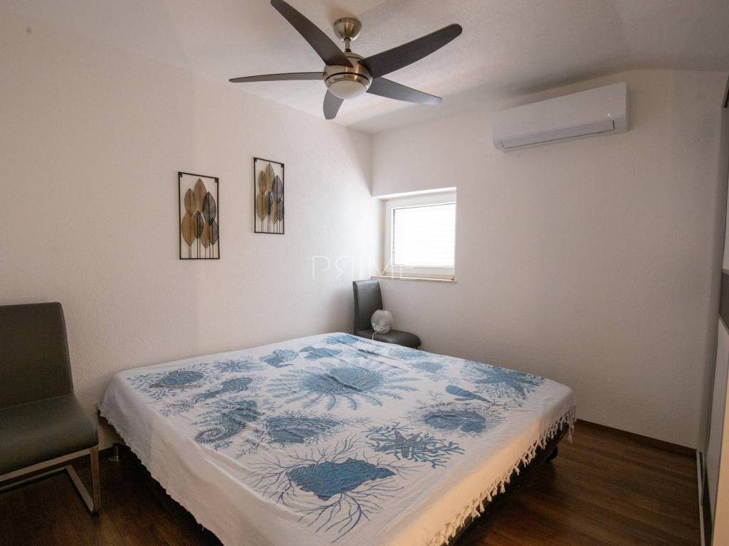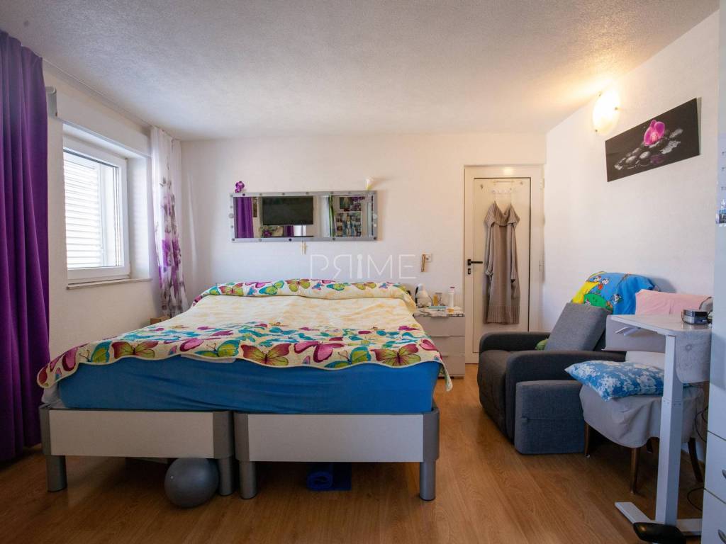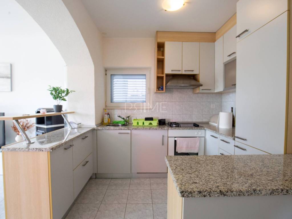 Raspored: Prizemlje: garaža te stan površine 70,82 m² (neto) s dvije spavaće sobe, dnevnim boravkom, kuhinjom i blagovaonicom, kupaonicom te izlazom na dvorište. Prvi kat: stan površine 74,57 m² s funkcionalnim rasporedom, dvije spavaće sobe i terasom. Drugi kat: stan površine 93,54 m² s tri spavaće sobe, prostranim dnevnim prostorom i terasom s otvorenim panoramskim pogledom na more.