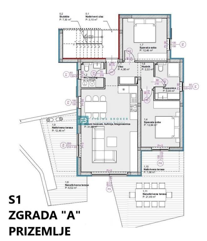Apartment S1 with a total usable area of 108.89 m2 (living area 74.17 m2 + terrace 47.53 m2 + garden 123 m2 + parking 29 m2) is located on the ground floor. It consists of an entrance hall, hallway, toilet/laundry room, two bedrooms, bathroom, kitchen with dining room and living room with access to a covered and uncovered terrace of 47.53 m2 and a garden of 123 m2. The apartment has two parking spaces. The price is: €299,000.