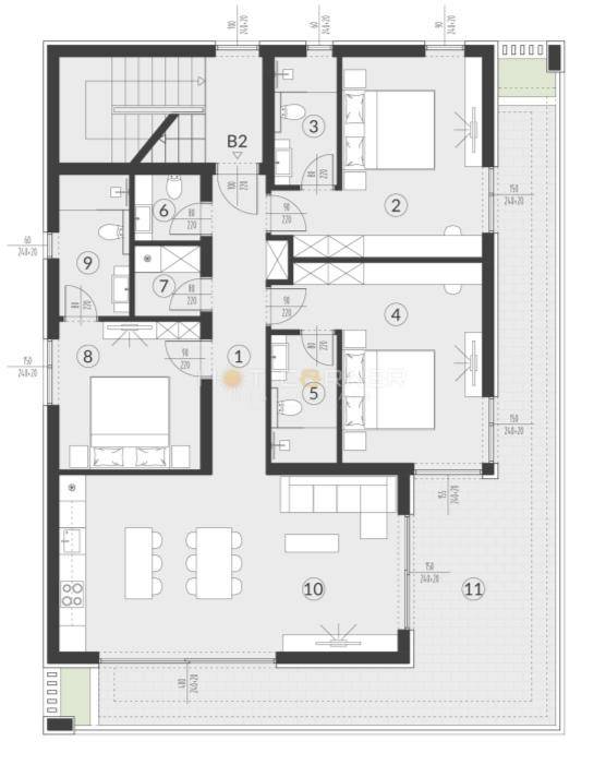 Standard & equipment: – premium three-layer oak parquet – large-format Italian ceramic tiles – underfloor heating throughout via heat pump – hot water regulated by heat pump – all coverings adapted to underfloor heating system – air conditioning in living room and bedrooms