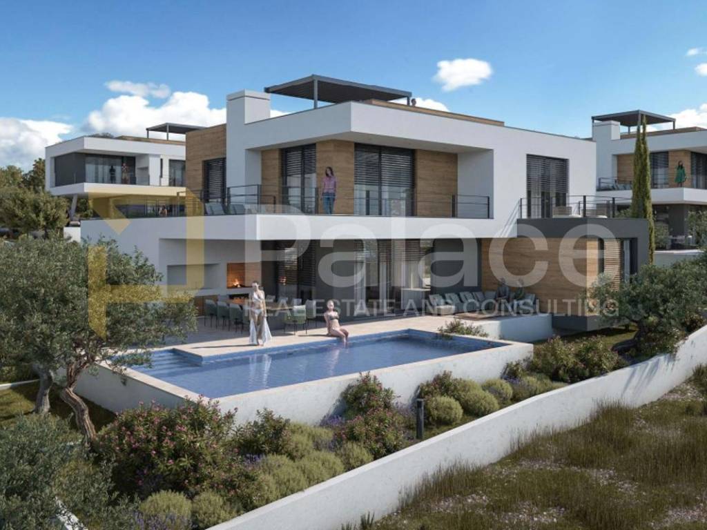 The upper floor is accessed by internal stairs, where there is a wardrobe and three spacious bedrooms, each with its own bathroom, and two have their own terrace. There is also an additional bedroom/office/wellness room on the floor (if it is to be a wellness room, installations for a sauna and a whirlpool bath will be prepared), which also has its own terrace. All terraces and rooms offer a beautiful open view, further enhancing the exclusivity of this property.