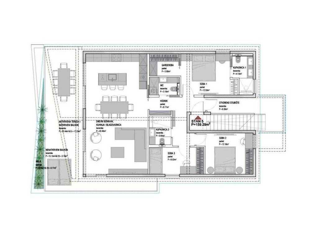 Penthouse with an open sea view represents an extremely luxurious, spacious and elegant living space that combines comfort, privacy and modern amenities. With a total living area of 160 m, with an additional covered terrace of 22 m and an impressive roof terrace of 140 m, this extraordinary penthouse offers a living experience at the highest level.