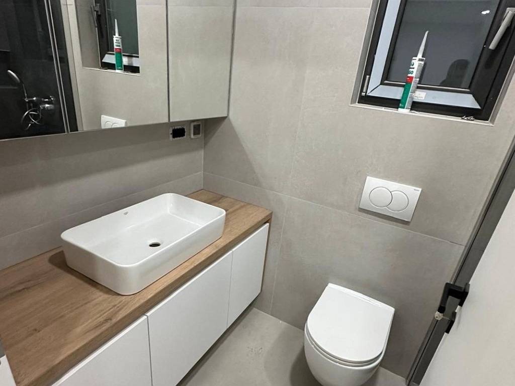 The latest techniques and technologies were applied during construction and decoration, using top-quality materials and impeccable workmanship. Special value is given by modern anthracite-colored joinery with triple-layered glass, electric shutters and mosquito nets, aluminum entrance doors, facade with insulation and natural stone cladding. Tempered glass railings, custom-made interior joinery, large-format floor ceramics and bathroom equipment from renowned manufacturers emphasize the quality of performance. The bathroom furniture is custom-made to maximize space utilization, and electric underfloor heating provides additional comfort. The apartment is air-conditioned, equipped with a burglar-proof and fire-resistant entrance door, video intercom, built-in LED lighting and ambient lighting solutions.
