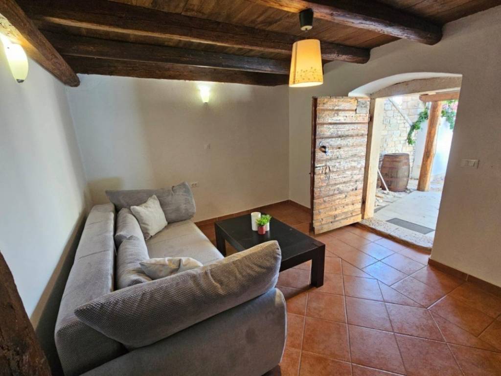 The house is located in a quiet village, about 7 km from Poreč and the coast. The property was renovated in 2013 and is fully furnished, with a total of approximately 120 m of living space. The ground floor has a living room with a fireplace, a kitchen with a dining room, a bathroom and a storage room. The first floor has two bedrooms and an additional bathroom, while the attic is a space intended for completion.