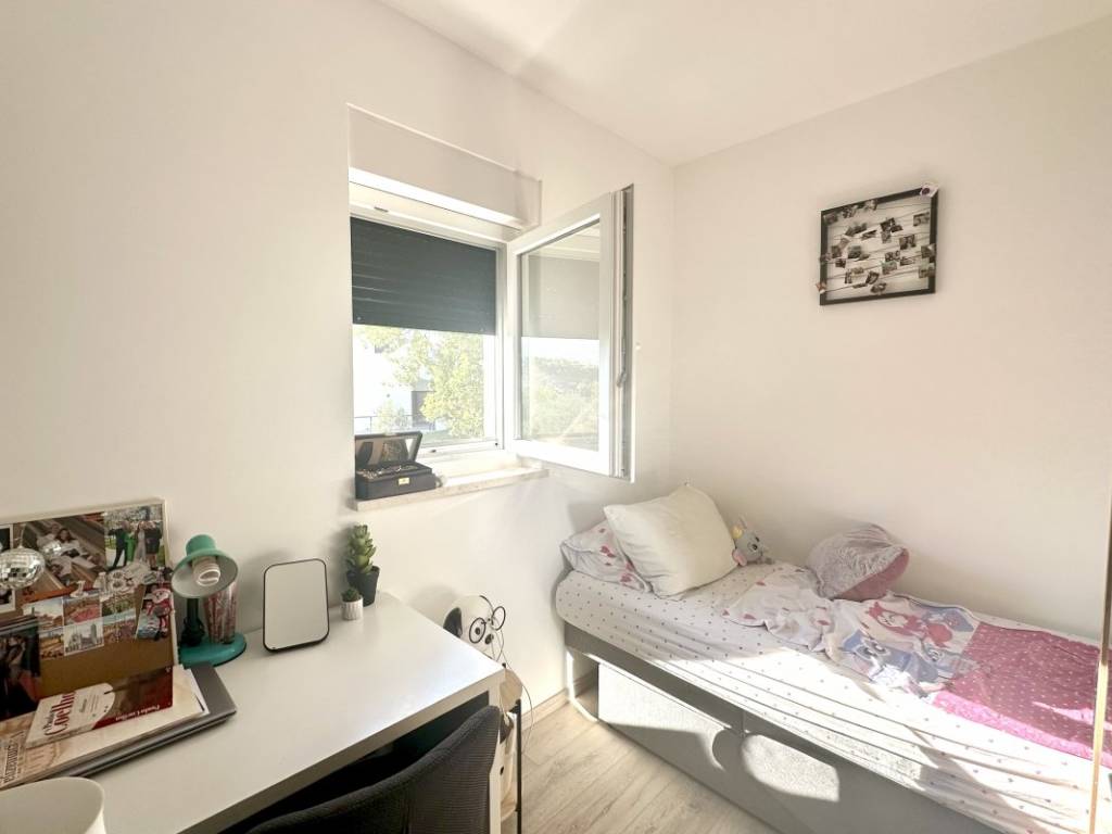 The house spreads over three floors, each with a clearly defined functional layout. On the first floor, there is a kitchen with a dining area and living room in an open-plan concept, opening onto a spacious terrace perfect for gatherings. There is also a small guest room and a practical storage room. The second floor includes the main entrance, hallway, and a guest toilet. On the third floor, there are three bedrooms, one of which is designed as a walk-in closet but can also be used as an additional bedroom, as well as a spacious bathroom with an interesting layout and hidden features. Two of the bedrooms have access to a balcony with views of untouched nature.