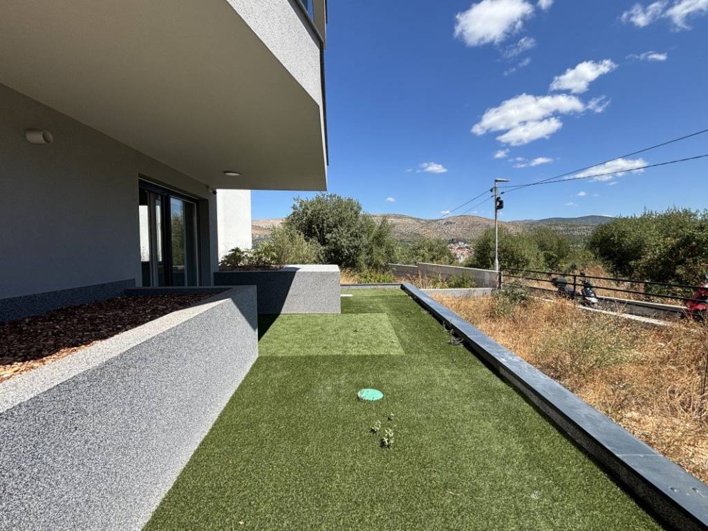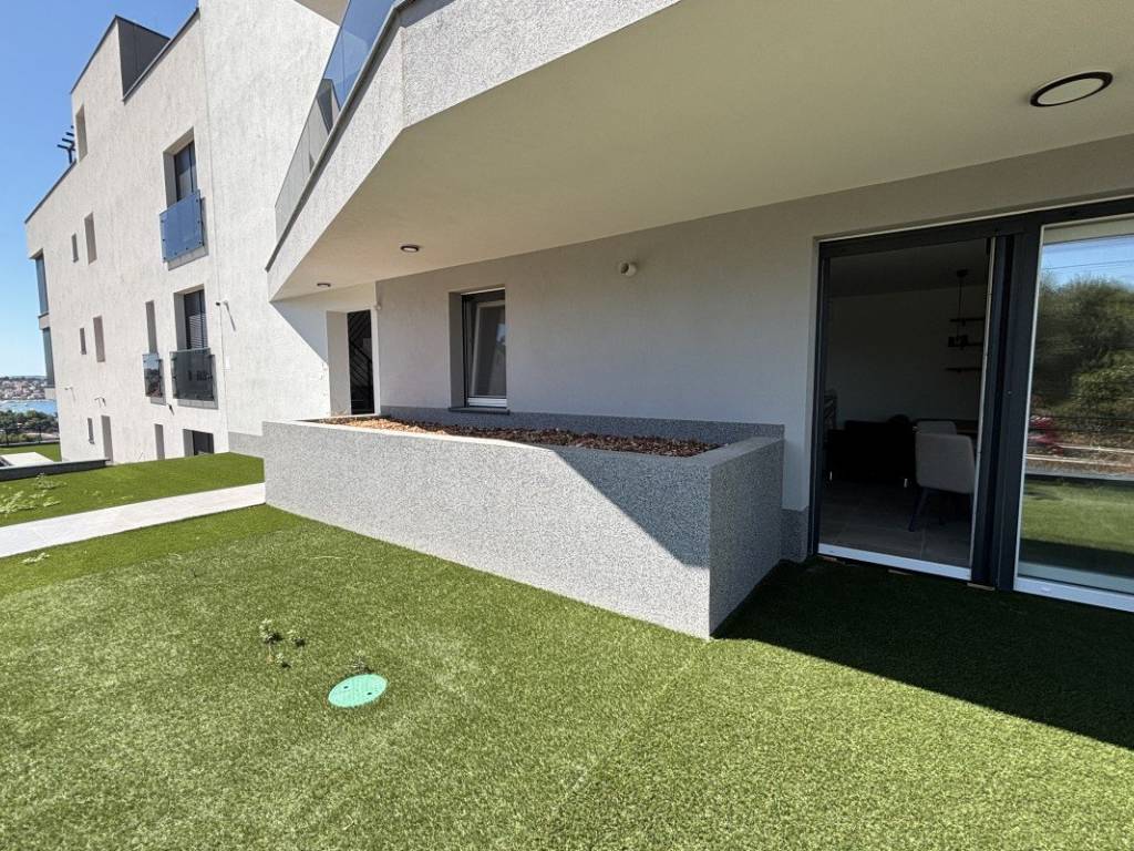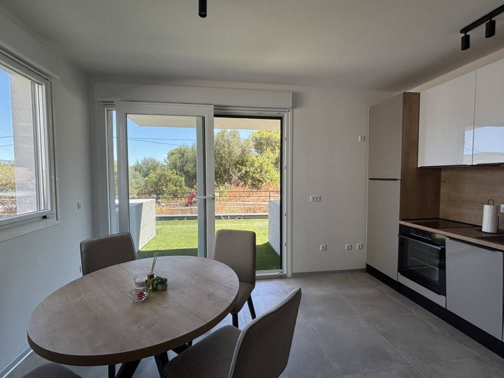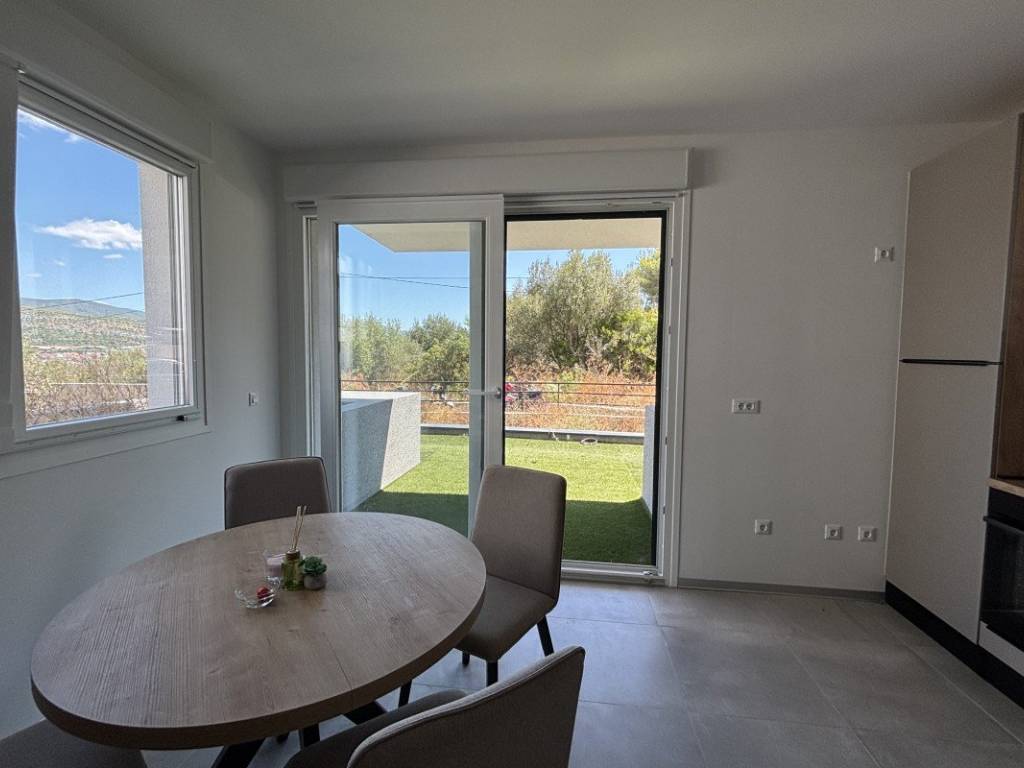 A one bedroom apartment with modern design with access to the garden is for sale in Trogir on the island of Čiovo, in one of the most attractive tourist locations in the area. The apartment is located in a quiet, newly built residential building, ideal for living or renting throughout the year. Next to the building there is an associated outdoor parking space, which is an exceptional convenience, especially during the tourist season when the availability of parking spaces is limited. The apartment is located on the ground floor of a residential building with an elevator connecting all floors. The apartment is characterized by modern equipment, quality materials and modern interior design with attention to detail.