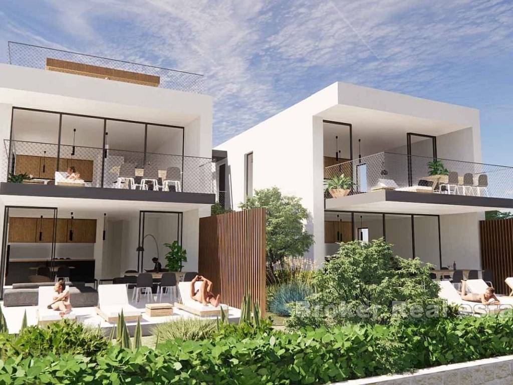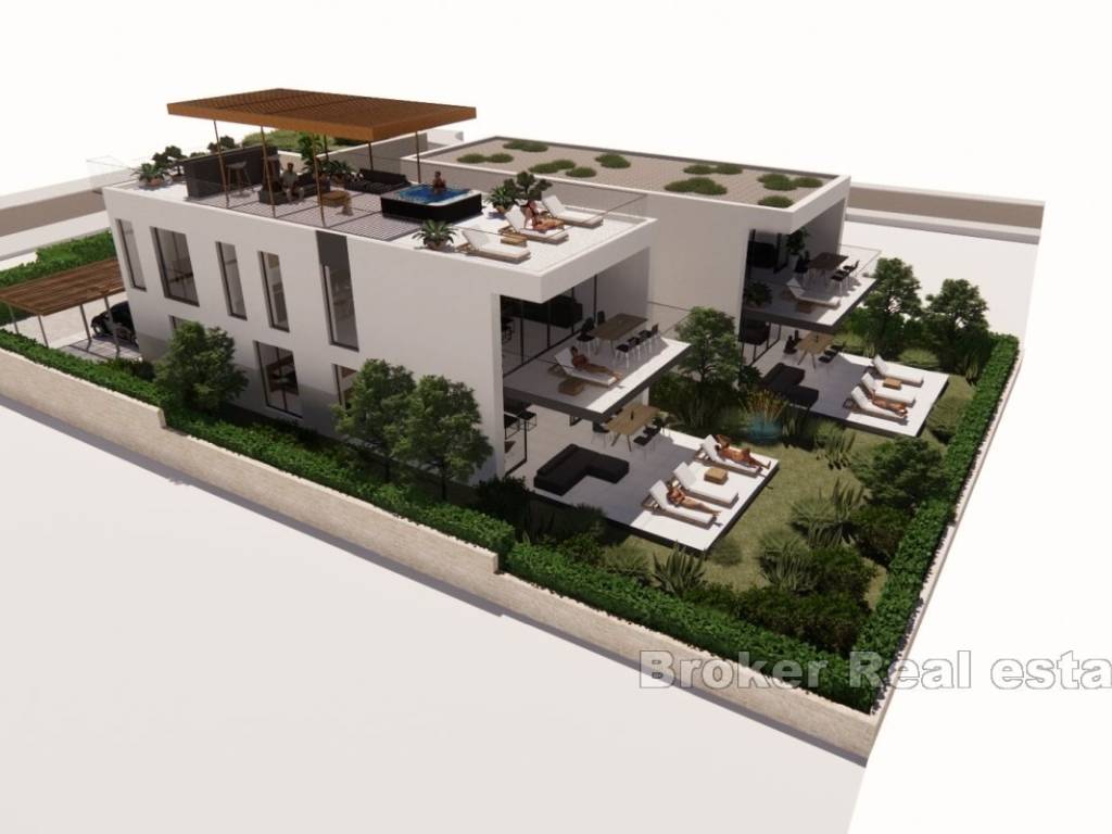 For sale is a luxurious apartment on the island of Ugljan, located in a smaller new building in the second row to the sea. This spacious penthouse offers 126 m of living space spread over two floors, with an additional floor occupied by a private roof terrace that runs the length of the building.