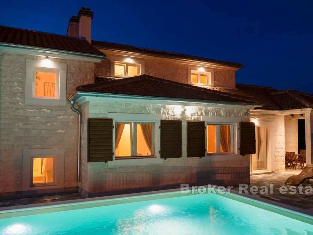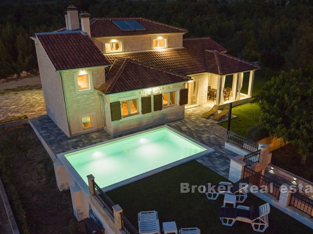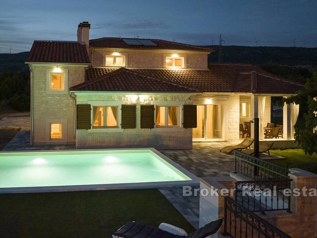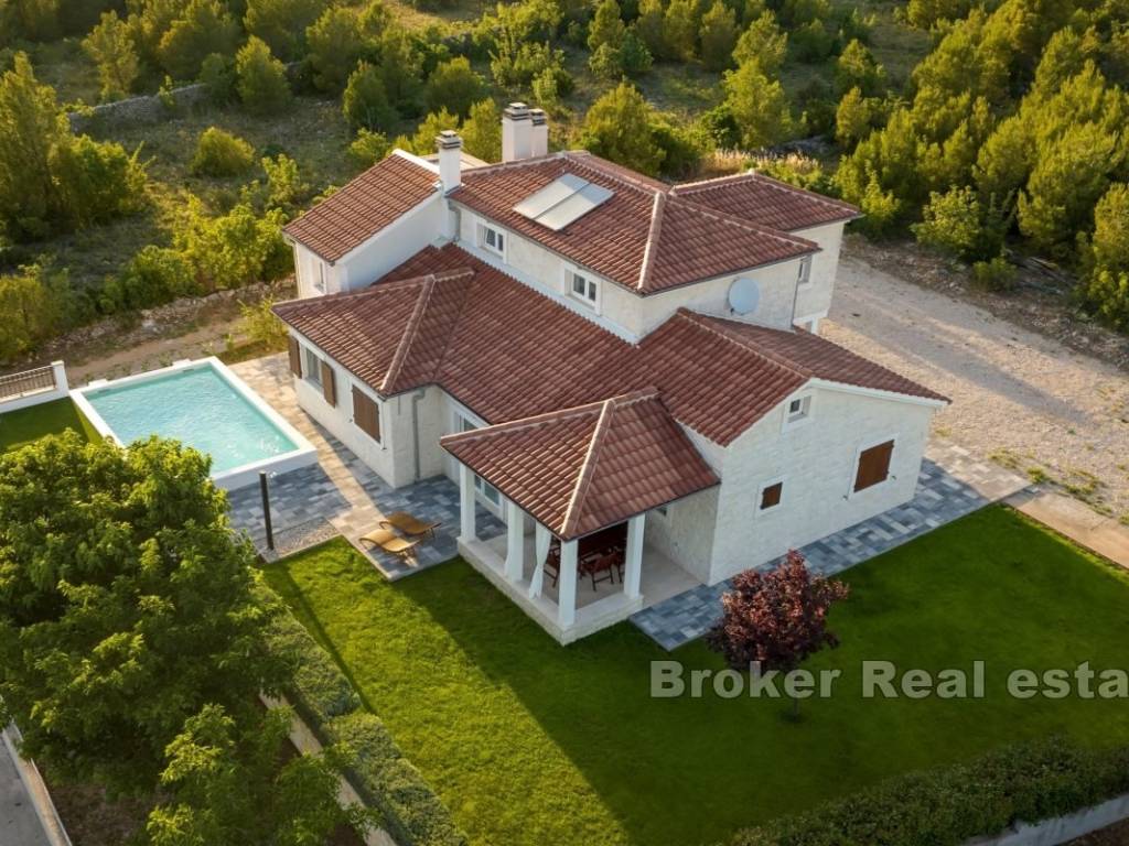 A villa is for sale, located in the surroundings of Šibenik, suitable for family living or as an investment for tourist rentals. The villa consists of three floors. The basement and boiler room are on the first floor. The second floor features two semi-covered terraces, a game room that includes darts, billiards, and a fireplace, a living room, dining room, kitchen, pantry, terrace, bathroom, WC, and a bedroom. On the third floor, there are two bedrooms, a bathroom, laundry room, hallway, and terrace. The exterior of the house includes a pool, outdoor fireplace, garage, and multiple parking spaces. The yard is spacious, and the rectangular part can be used for a sports field. The house is equipped with solar panels and has underfloor heating in the living room, kitchen, dining room, and bathroom on the ground floor. The villa is located 4.3 km from the sea and 4.5 km from the center of Šibenik, providing a peaceful atmosphere close to the city.