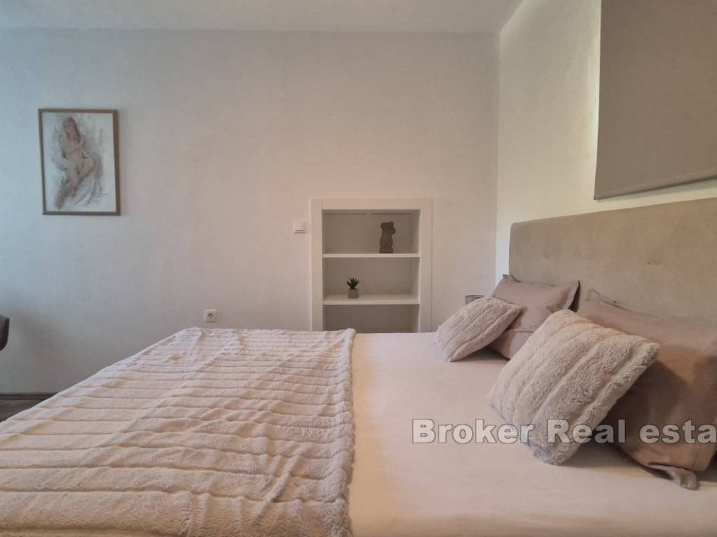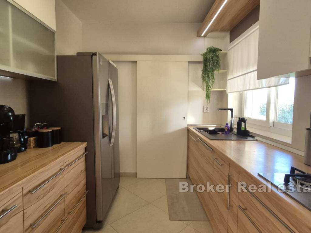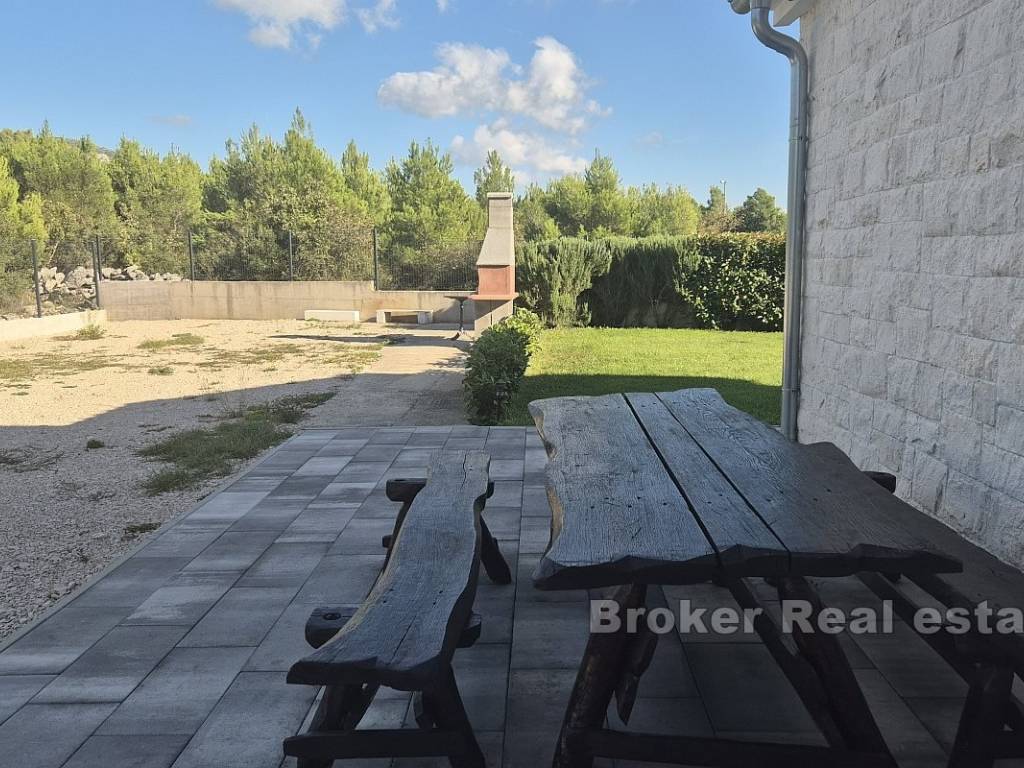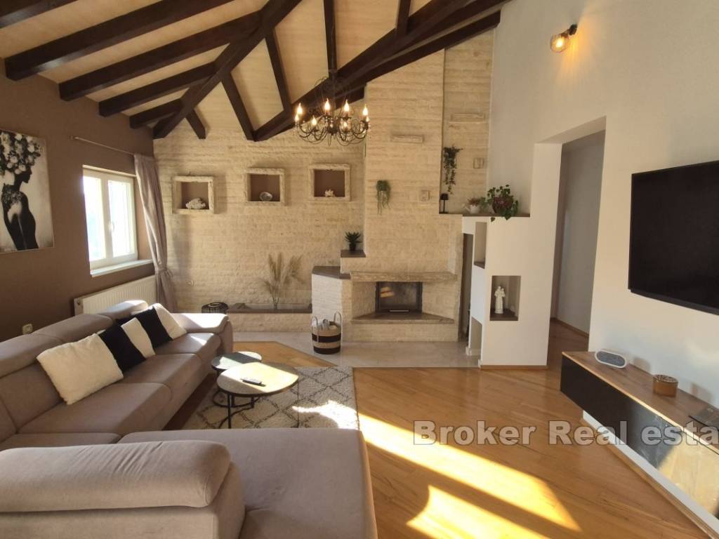 A villa is for sale, located in the surroundings of Šibenik, suitable for family living or as an investment for tourist rentals. The villa consists of three floors. The basement and boiler room are on the first floor. The second floor features two semi-covered terraces, a game room that includes darts, billiards, and a fireplace, a living room, dining room, kitchen, pantry, terrace, bathroom, WC, and a bedroom. On the third floor, there are two bedrooms, a bathroom, laundry room, hallway, and terrace. The exterior of the house includes a pool, outdoor fireplace, garage, and multiple parking spaces. The yard is spacious, and the rectangular part can be used for a sports field. The house is equipped with solar panels and has underfloor heating in the living room, kitchen, dining room, and bathroom on the ground floor. The villa is located 4.3 km from the sea and 4.5 km from the center of Šibenik, providing a peaceful atmosphere close to the city.