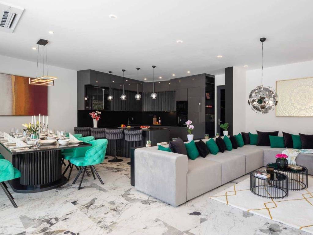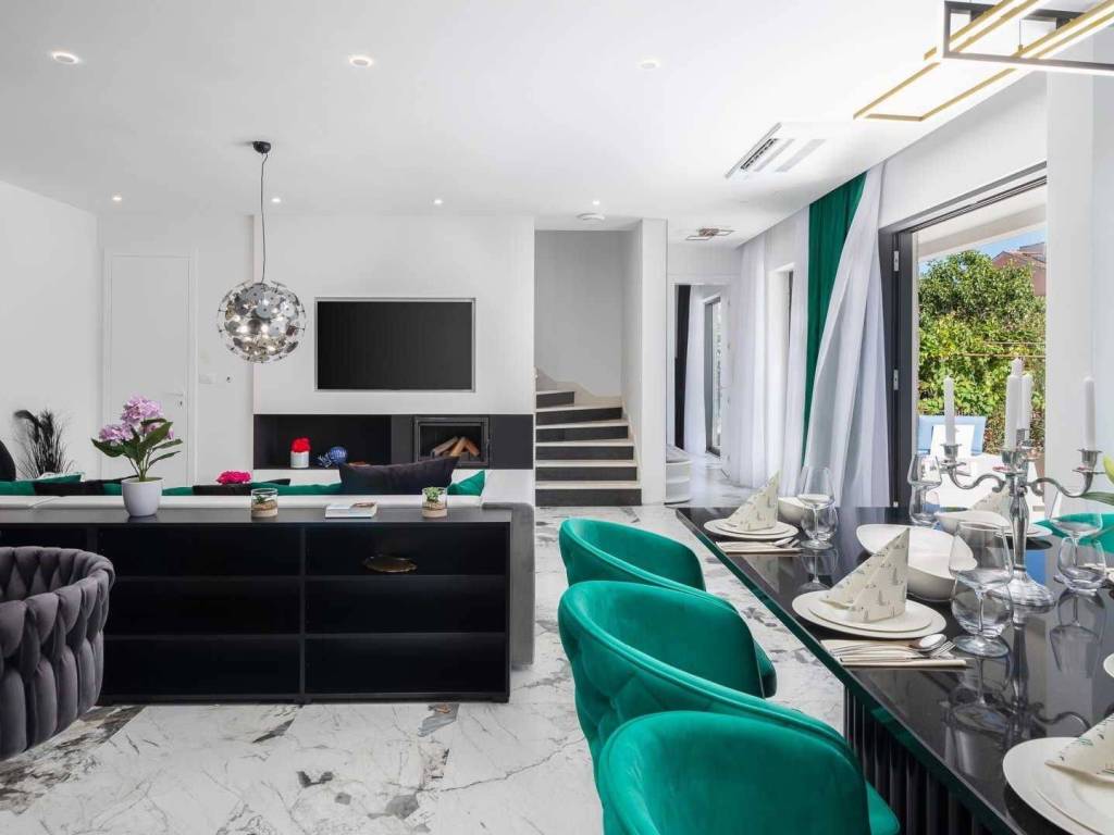 The villa is equipped with quality equipment and furniture, and from the technical information we highlight the heat pump, water-based underfloor heating throughout the house, Wi-Fi air conditioning in every room, and the digital system for accessing the entrance gates using a code.