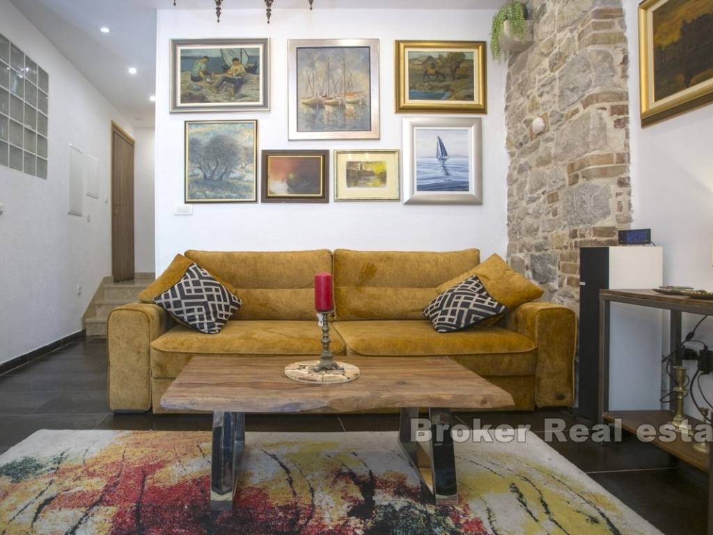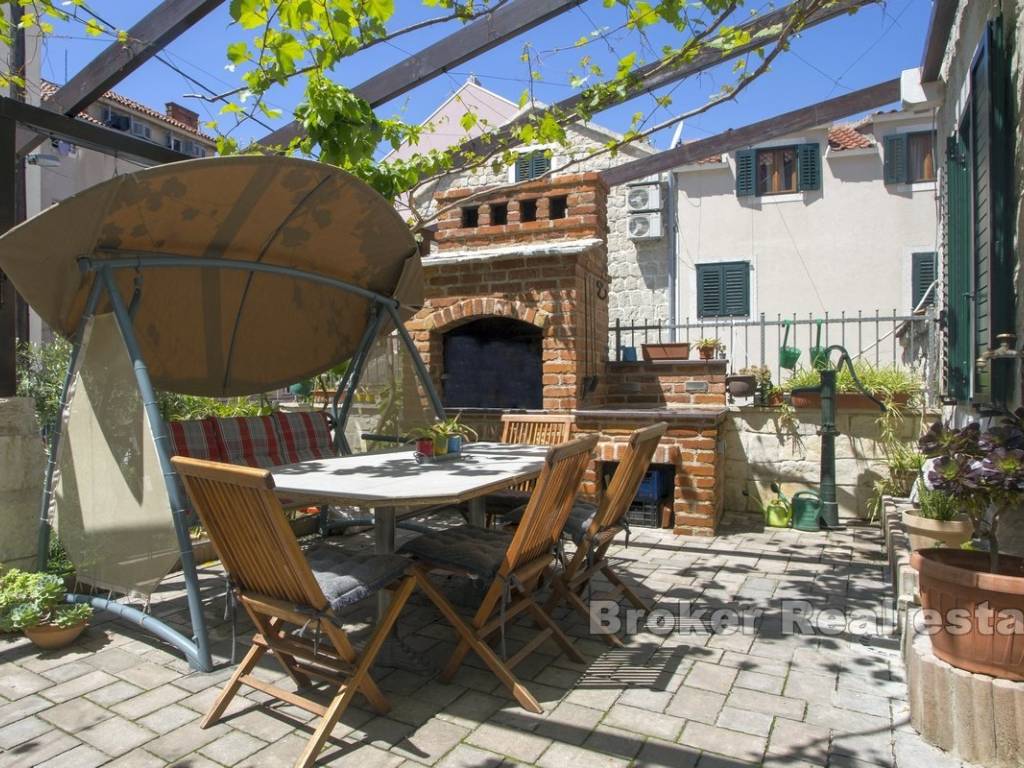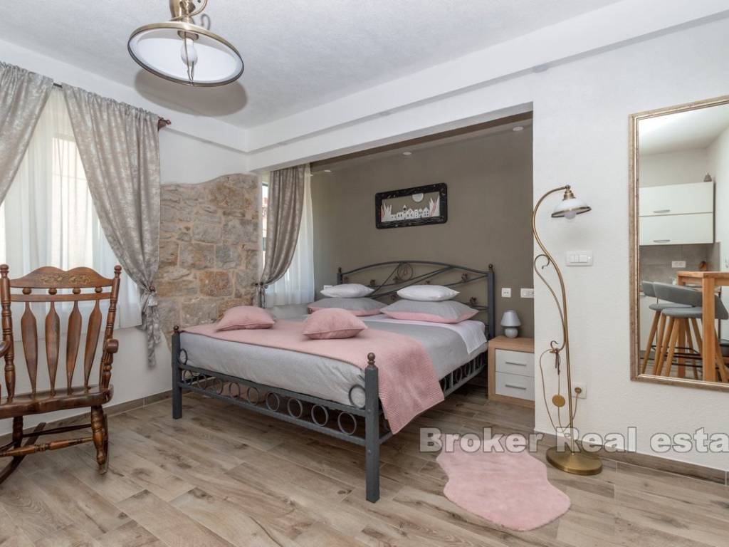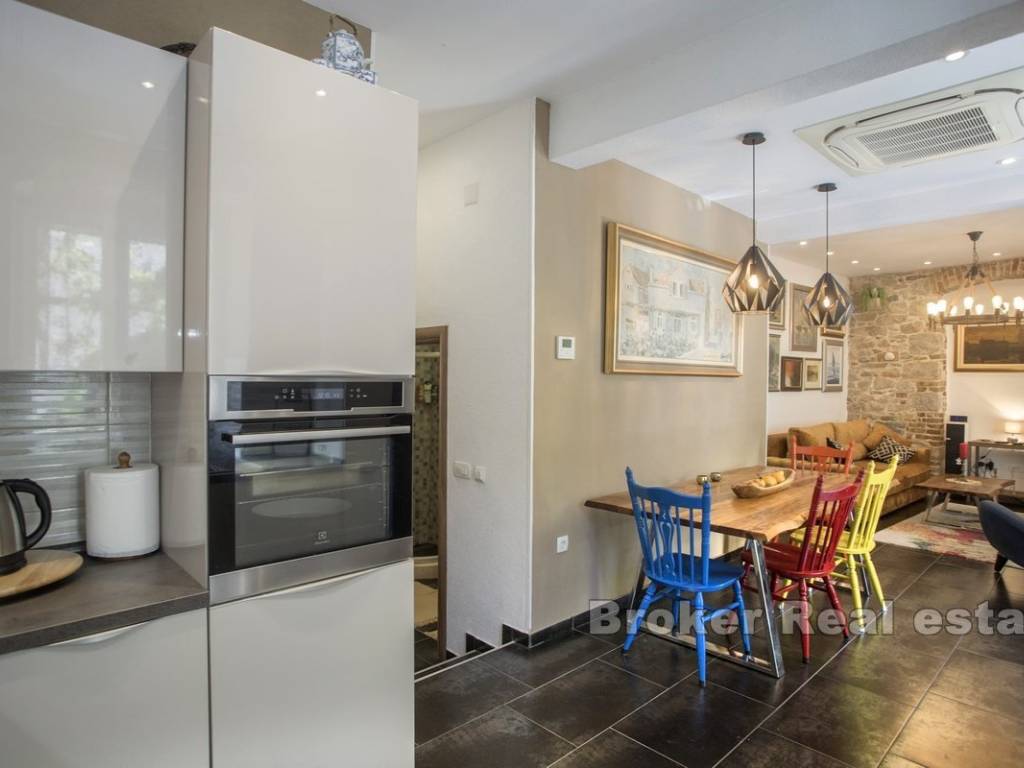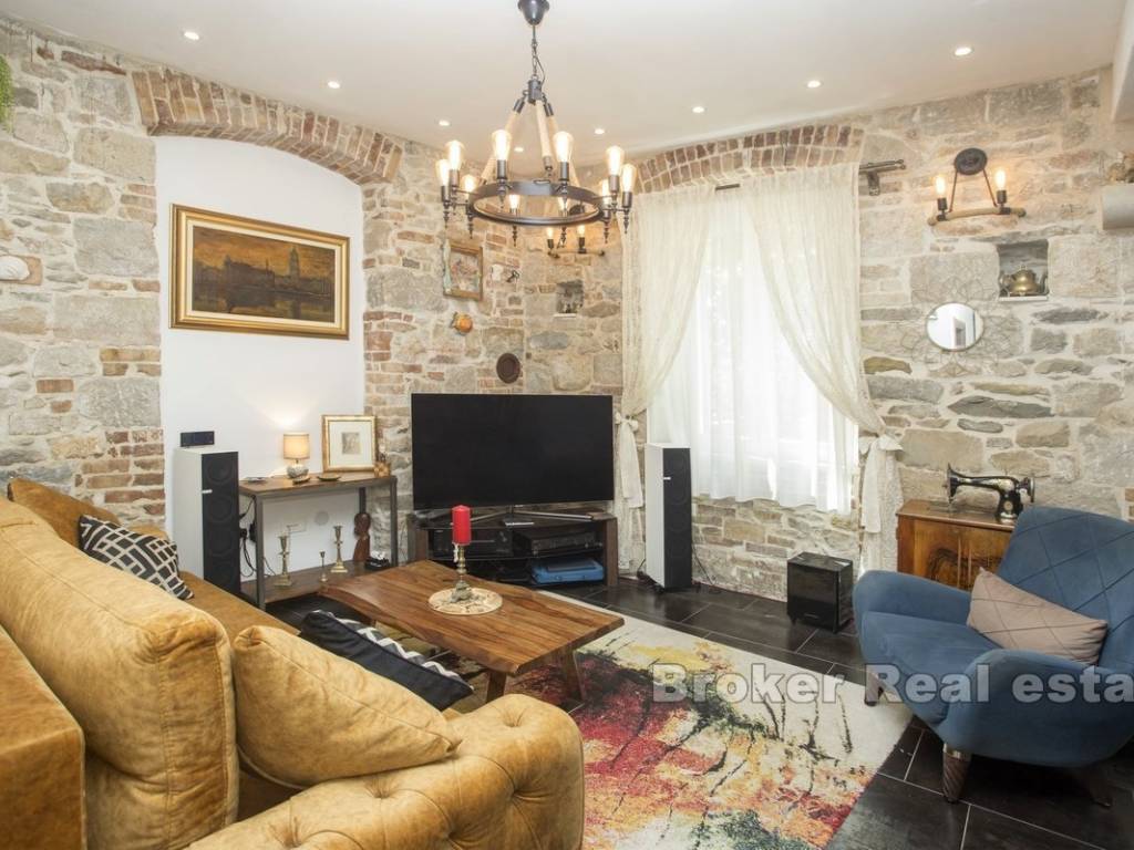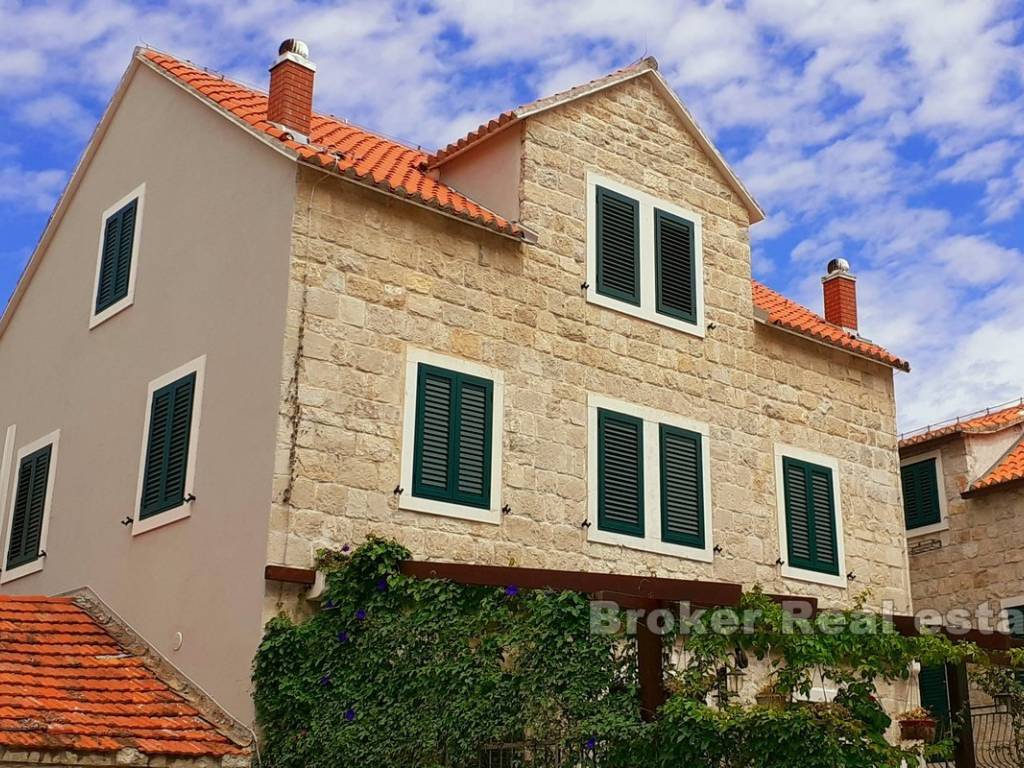 Stone detached house near the city center, just a few minutes away from Diocletians Palace and the waterfront. Its 160 m extends over three floors, consists of five separate units and has a southern orientation. On the ground floor of the house there is a two-room apartment with its own entrance. Above it are four studio apartments with their own kitchens and bathrooms, which are connected by an internal staircase. The two-room apartment on the ground floor consists of an entrance hall, a hallway, two bedrooms, a bathroom, a kitchen with a dining room and a living room with access to the adjoining courtyard with a fireplace. The house was last renovated in 2018 and is equipped with a total of five air conditioners and underfloor heating in the ground floor apartment, and is sold furnished and equipped. There is parking for two cars in front of the building. The facility is an excellent choice for a tourist investment due to its location and proximity to all facilities attractive to tourists.